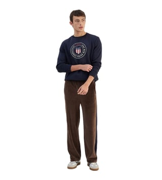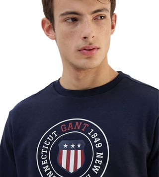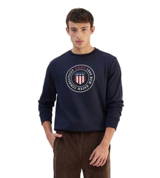 Elevate your casual style with the Gant men navy blue solid round neck sweatshirt. Crafted from high quality materials, this sweatshirt offers both comfort and style. The classic navy blue color pairs effortlessly with any outfit, while the round neck design adds a touch of sophistication. Perfect for everyday wear, whether you are running errands or meeting friends for coffee. Stay cozy and on trend with this versatile sweatshirt that will quickly become a staple in your wardrobe.