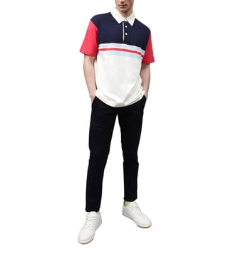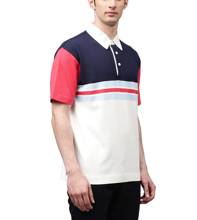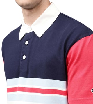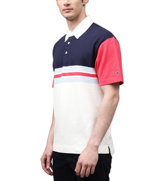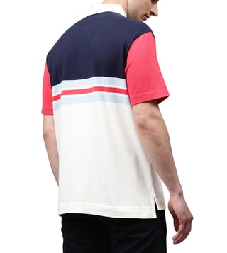Stay high on the fashion parameters by donning this polo t-shirt. It features cut-and-sewn color-blocking and printed logo tape across the front and back as a sporty detail. It has been exquisitely crafted and fuses style with comfort.