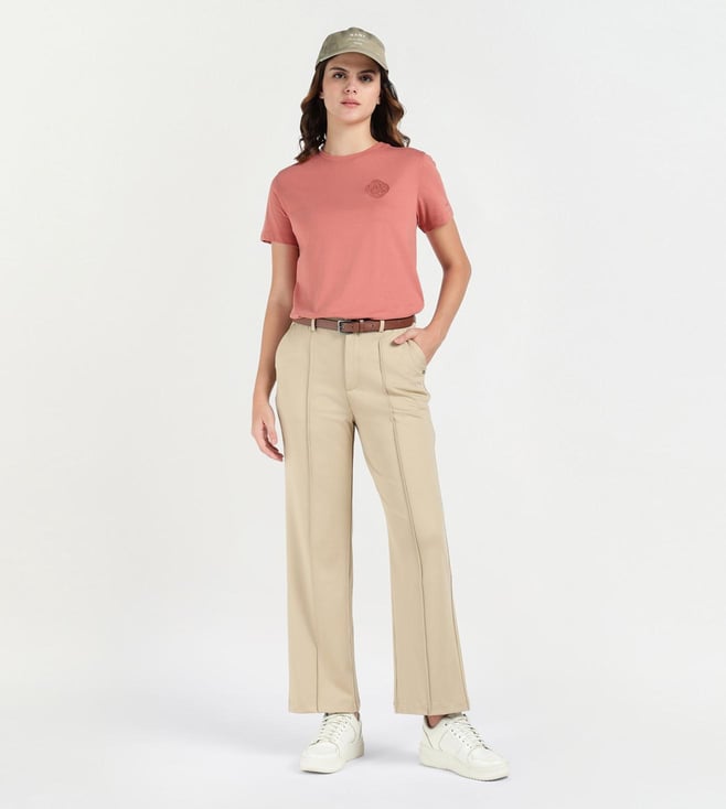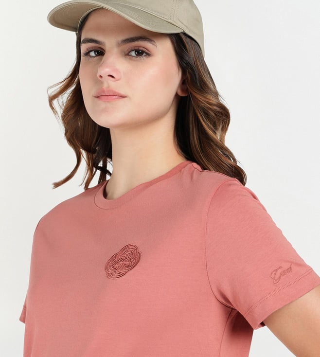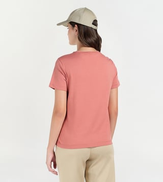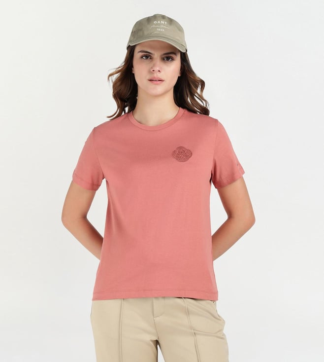 Elevate your everyday style with GANT Women Peach Cotton knitted embroidered crew neck short sleeves pull over T-shirt. Crafted with premium cotton for ultimate comfort. This regular fit tee features intricate embroidery detail for a touch of sophistication. Perfect for any occasion. This versatile piece effortlessly combines style and comfort. Embrace effortless elegance with this must-have wardrobe essential.