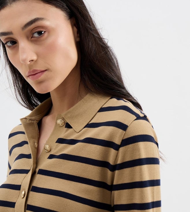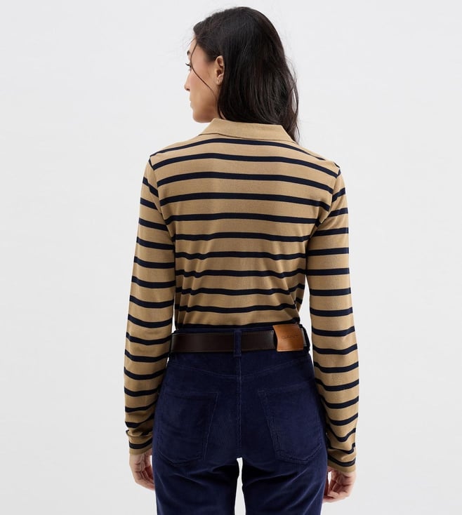 Gant Warm Khaki Regular Fit Stripe Long Sleeves Polo T-Shirt