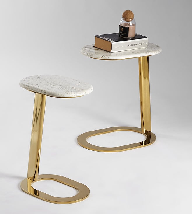 Redefine luxury with this C-shaped peg table, featuring a sleek travertine marble top and elegant gold-finished legs. A perfect blend of functionality and sophistication, it adds a touch of modern opulence to any space.