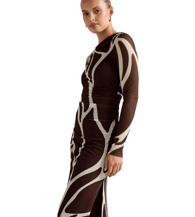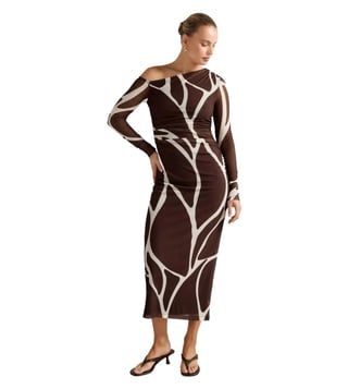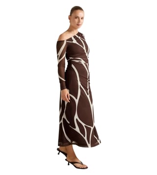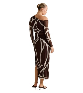 Elevate your evening look with the Gemma Tipped Shoulder Midi Dress from Forever New. This dress combines feminine glamour with a touch of edge, featuring an asymmetric neckline, abstract print, and ruched detailing on the waist for a flattering silhouette. Made from comfortable knit fabric with a minimum of 50 percent recycled polyester, this dress is not only stylish but also sustainable. Perfect for special occasions, this dress is lined for added comfort and has a side slit for ease of movement.