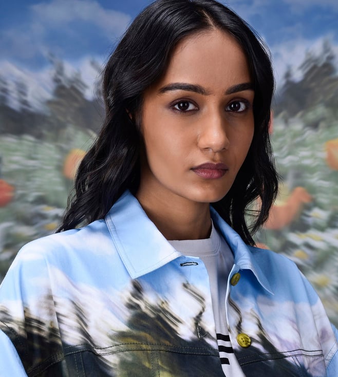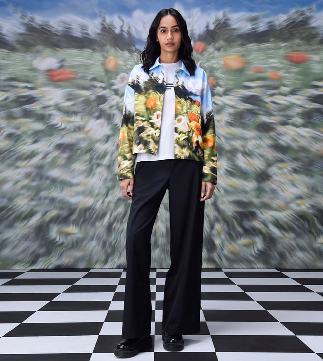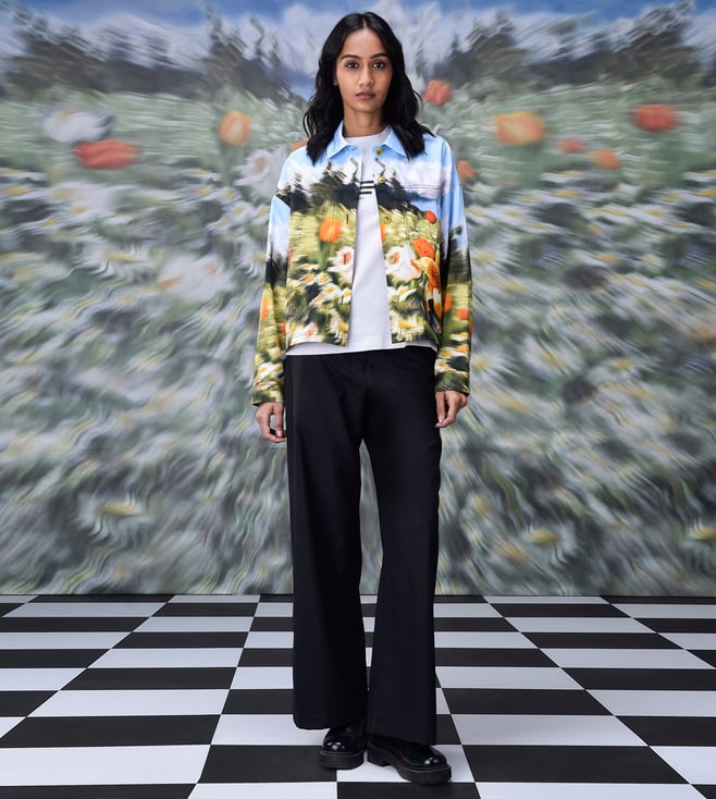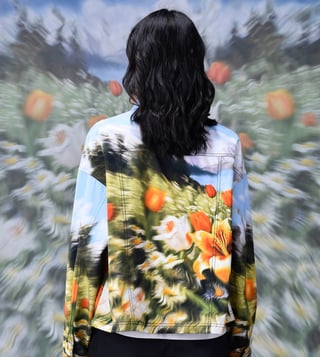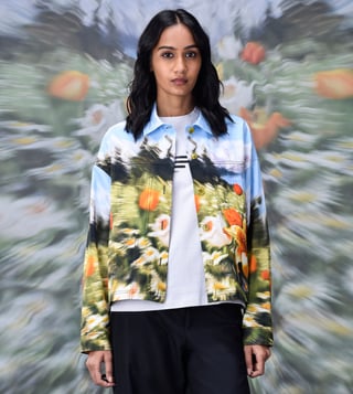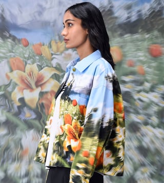 Elevate your wardrobe with our, Heavy Twill Jacket with tiger lilies, tulips and daises galore, with a heightened feeling of motion and blur, because as Didier Lecoanet quotes ,"A distorted garden print is like a moment stolen from a dream, vague and striking all at once.¿
