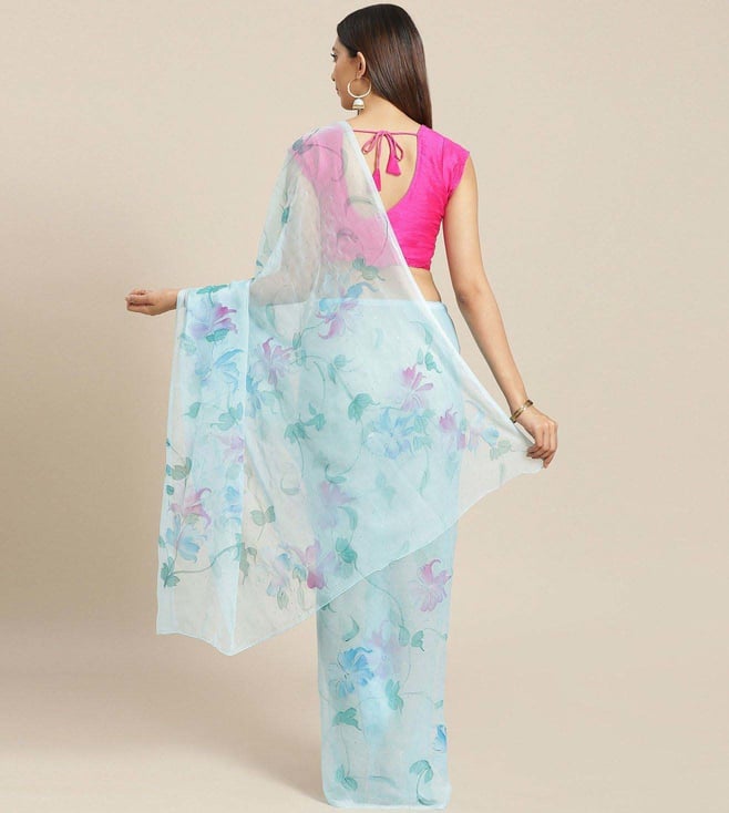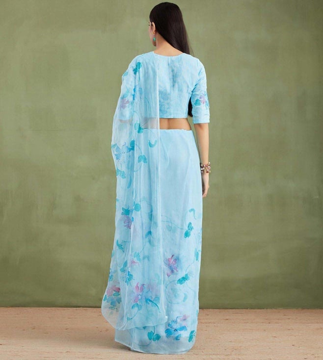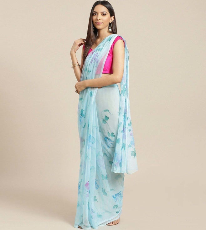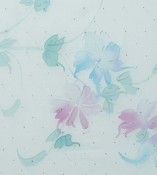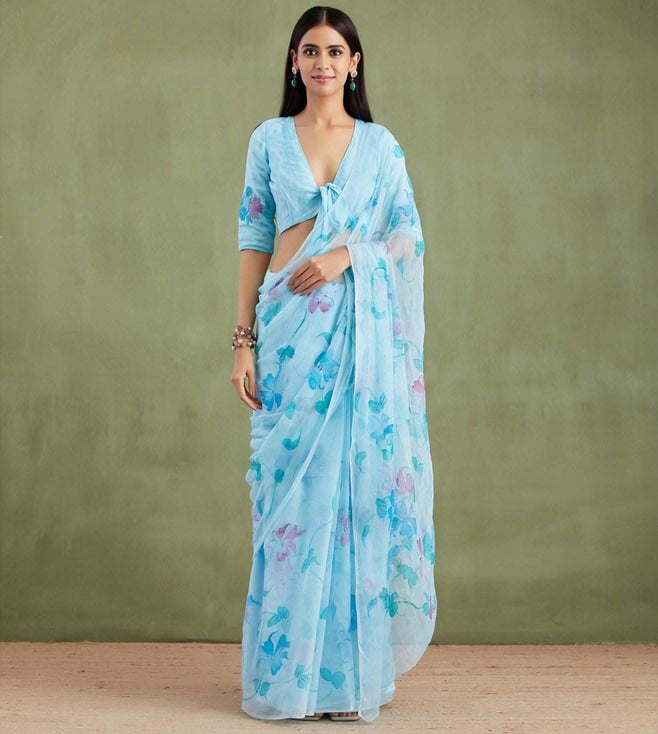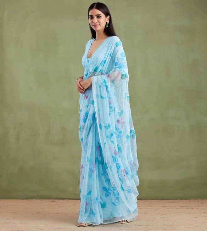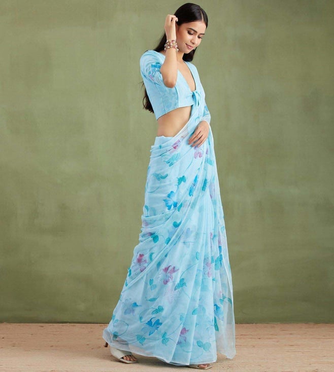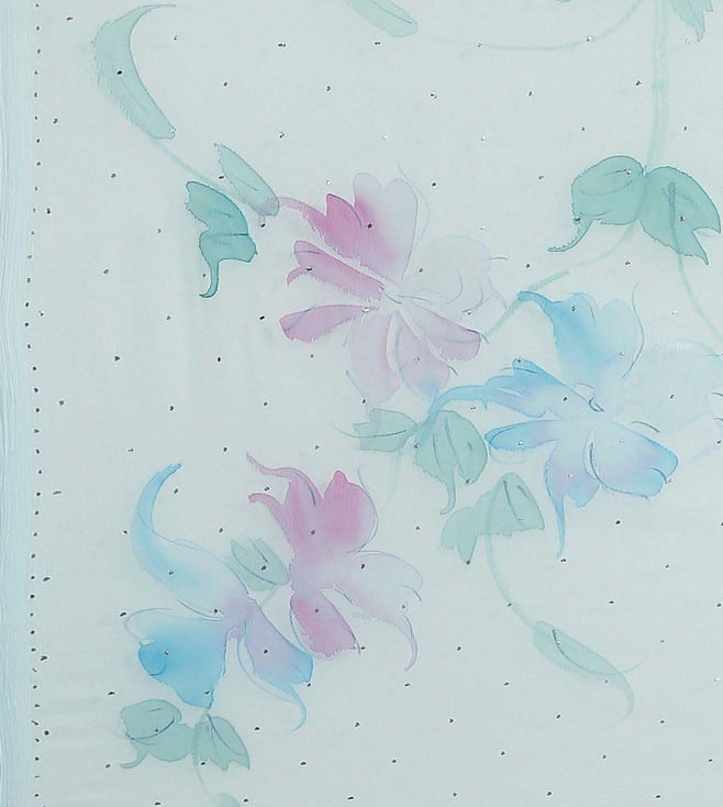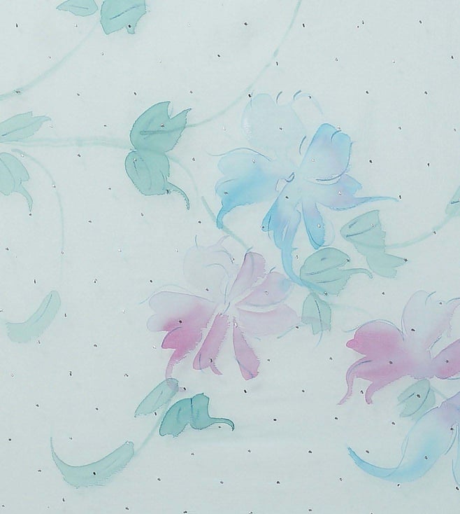 Make a style statement wearing this blue hand-painted mukaish chiffon saree by Geroo Jaipur. Featuring an alluring Nyka pattern, this gorgeous saree is perfect for any traditional event or celebrations. Team it up with your favourite ethnic jewellery to stand out. Disclaimer: All other items in the image are only for display purposes and will not be a part of the delivery content. Product colour may slightly vary due to photographic lighting sources. Country of Origin - India.