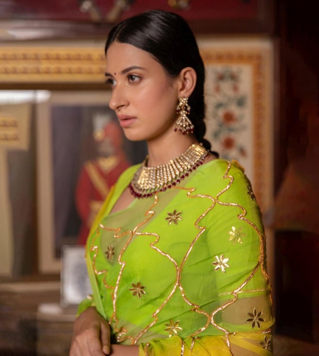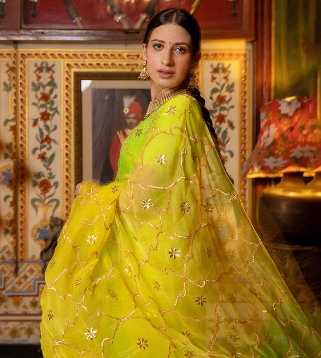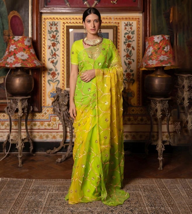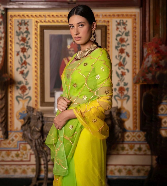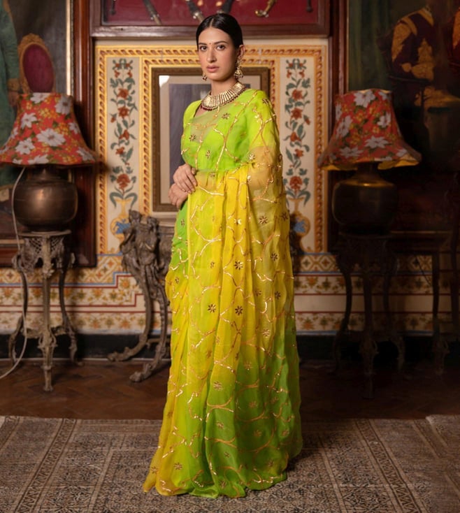 Geroo Jaipur Green Shaded Handcrafted Gota Patti Jaal Saree