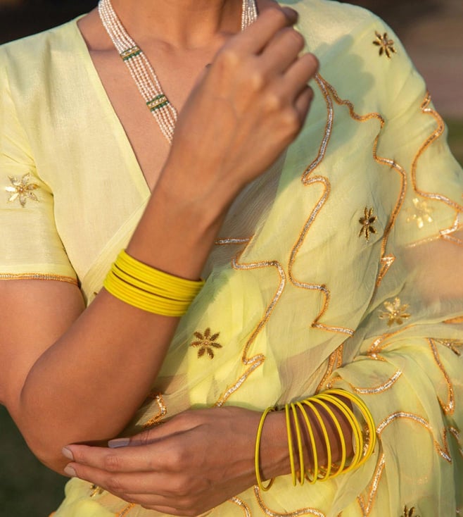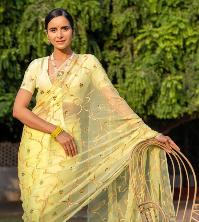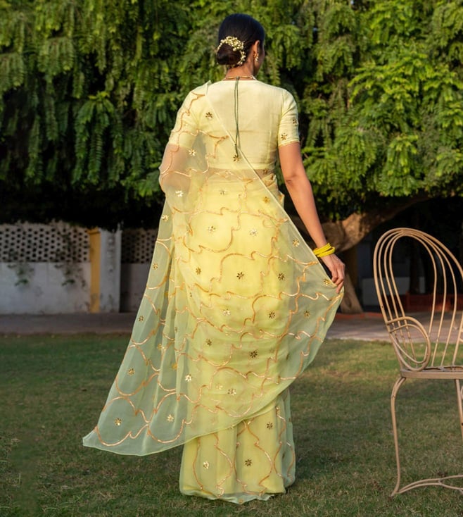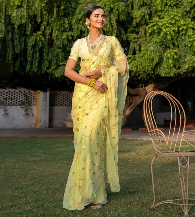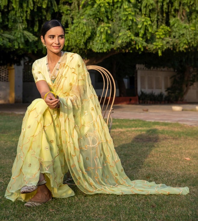 Geroo Jaipur Lime Green Handcrafted Gota Jaal Chiffon Saree