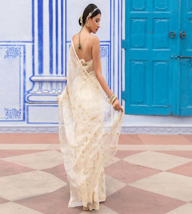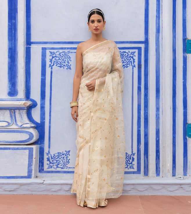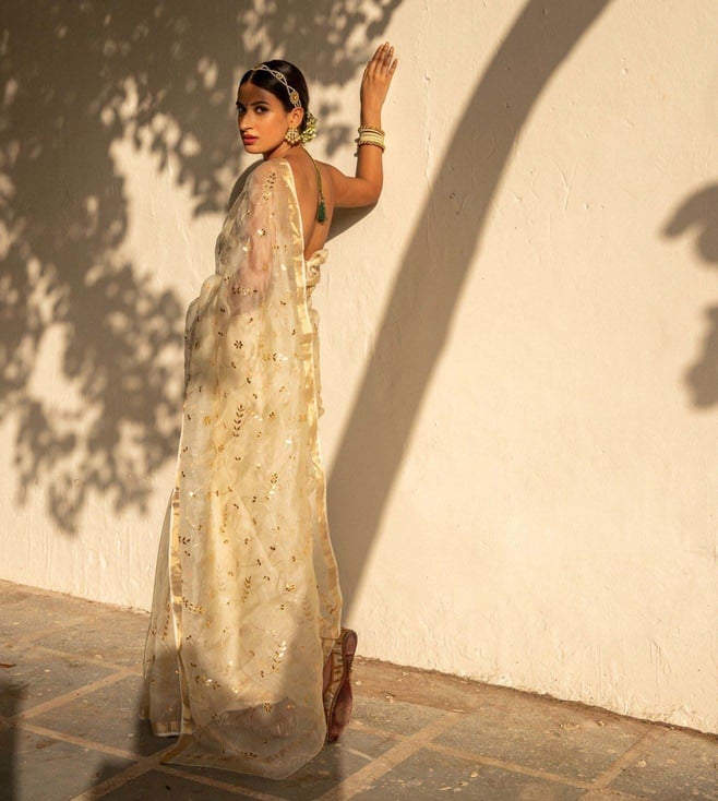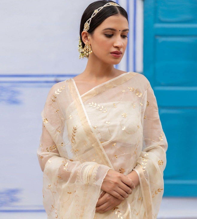 Geroo Jaipur Off White Hand Embroidered Gota Patti Pure Kota Silk Saree