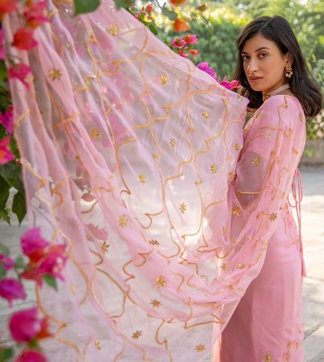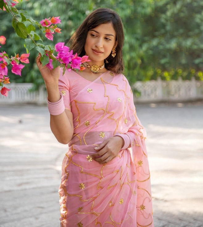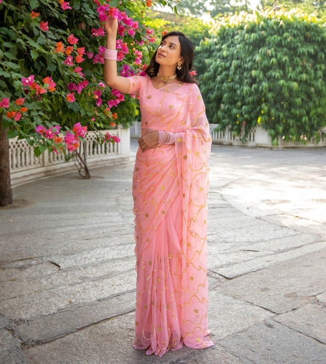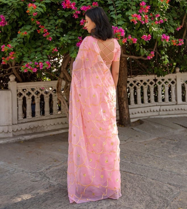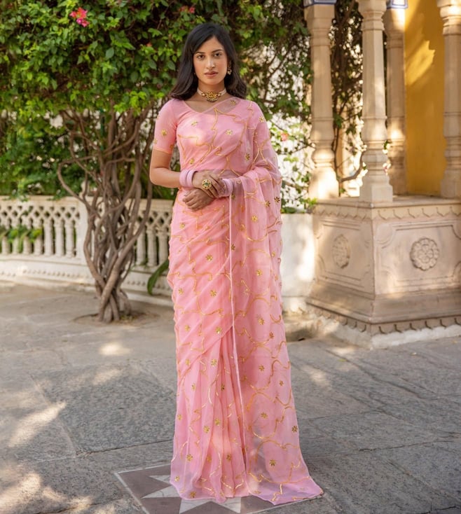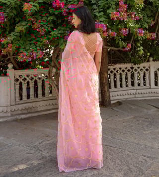 Geroo Jaipur Pastel Pink Handcrafted Gota Jaal Chiffon Saree