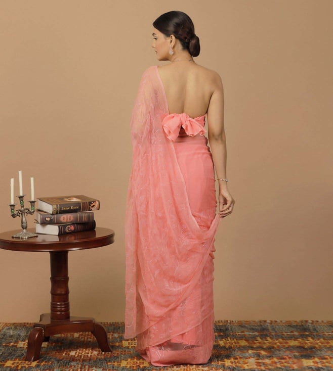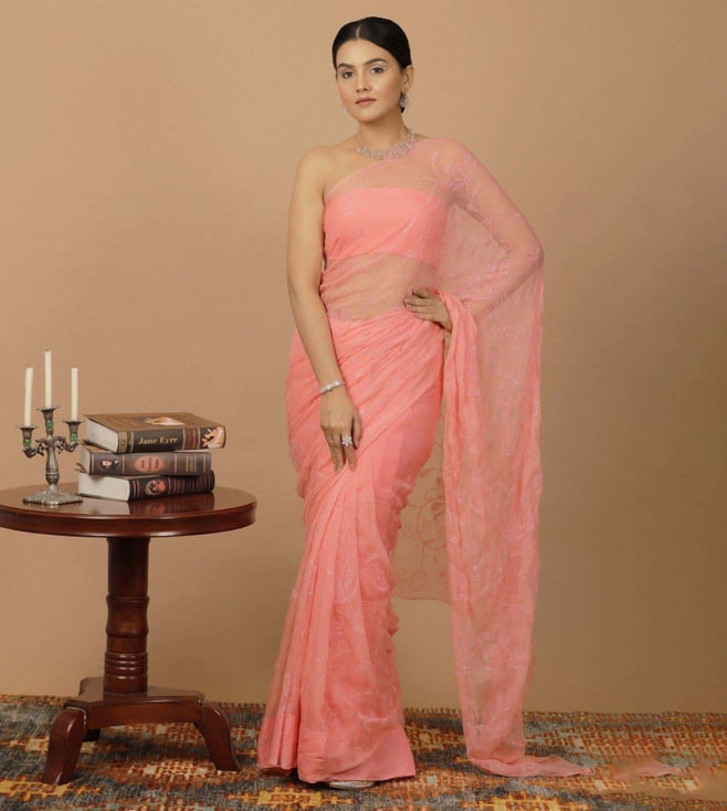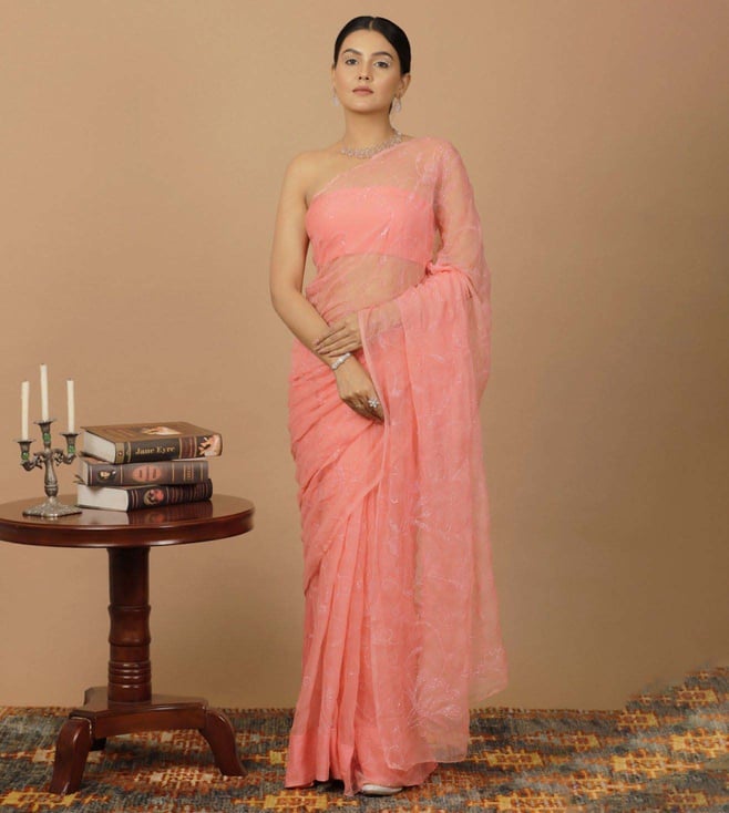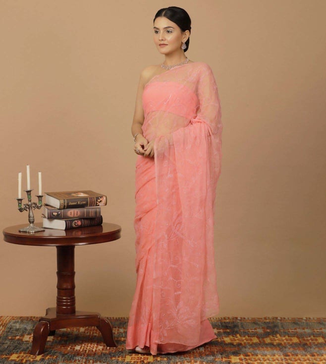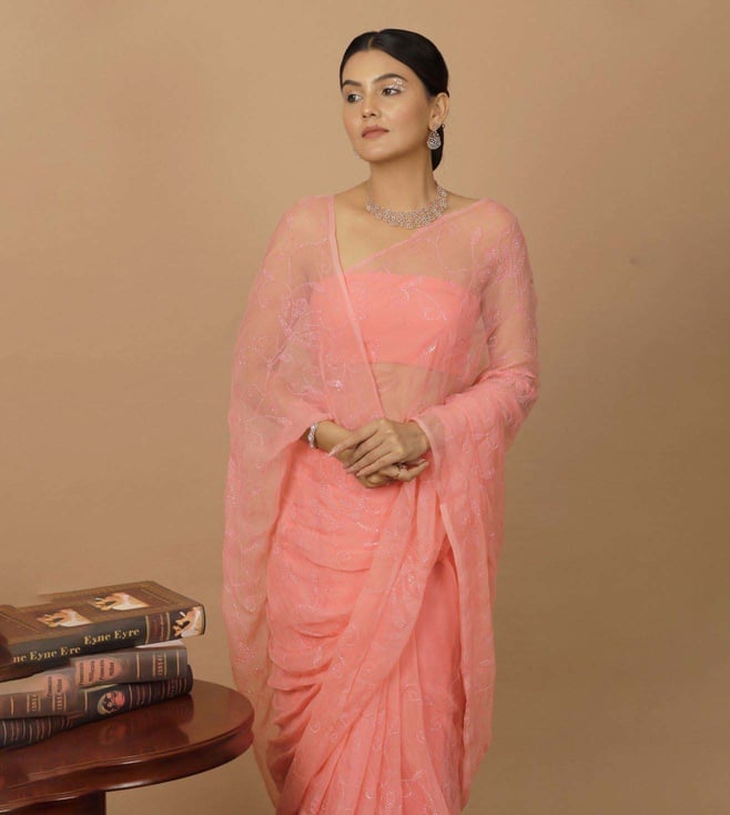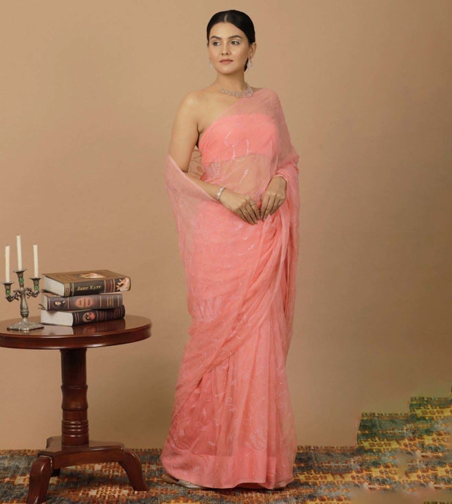 Geroo Jaipur Pink Handcrafted Sequin Jaal Chiffon Saree