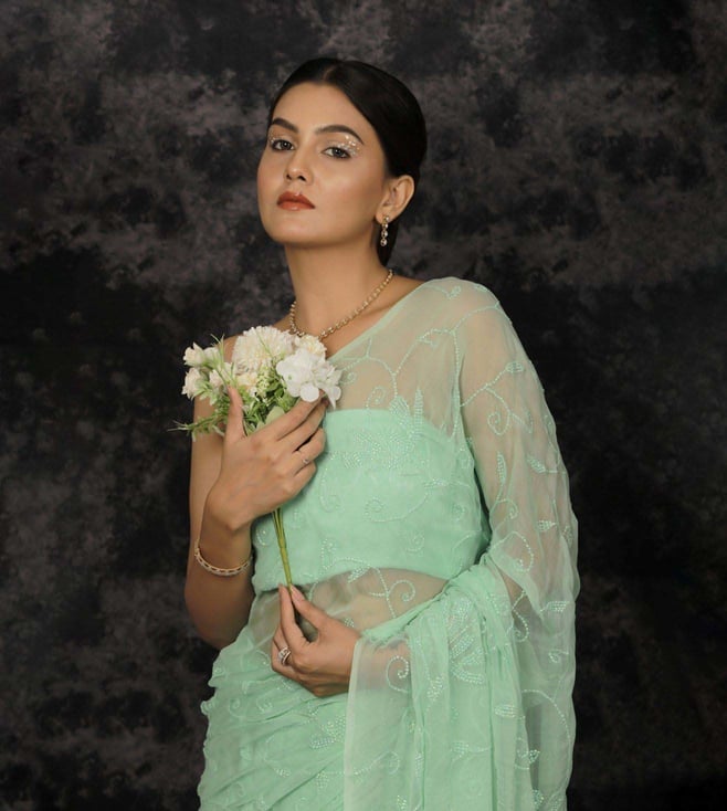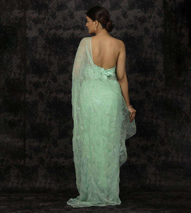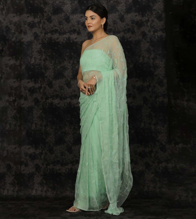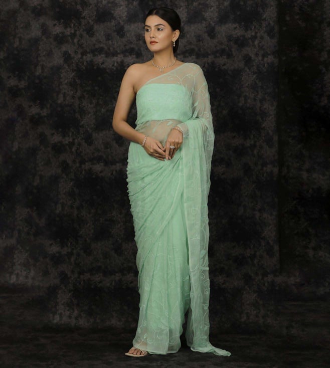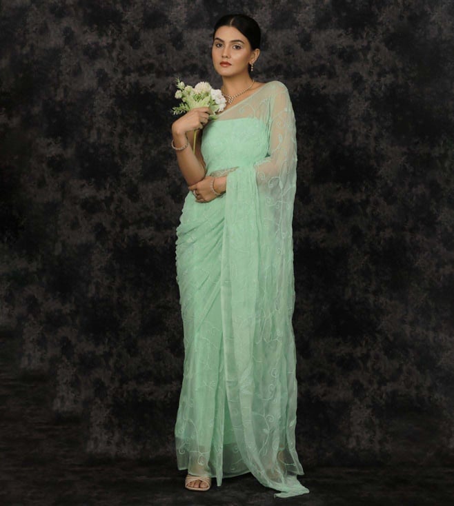 Geroo Jaipur Sea Green Chiffon Hand Embroidered Sequins Jaal Saree