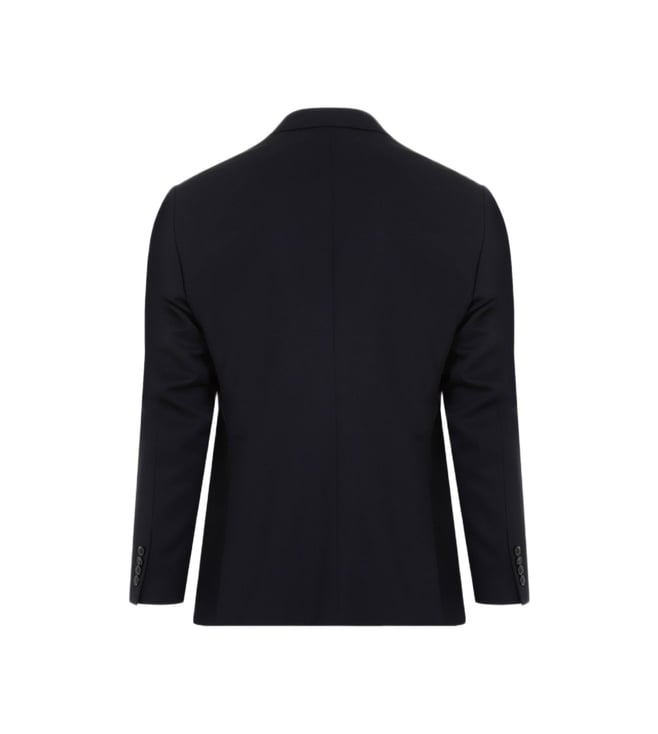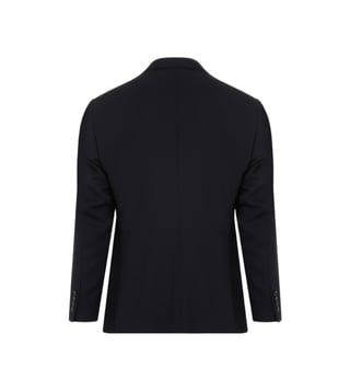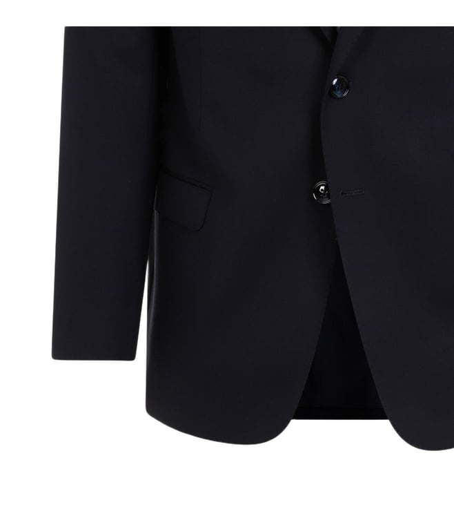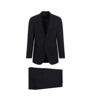 Giorgio armani dark navy-blue wool suit. Pure dark navy-blue wool suit. Notched collar jacket, front buttoned fastening, slit pocket on the chest, side slit pockets, long sleeves, buttoned cuffs, round hem. Mid-waist pants, front concealing zipped fastening, front buttoned fastening, belt loops, side pockets, back slit buttoned pockets, straight hem.