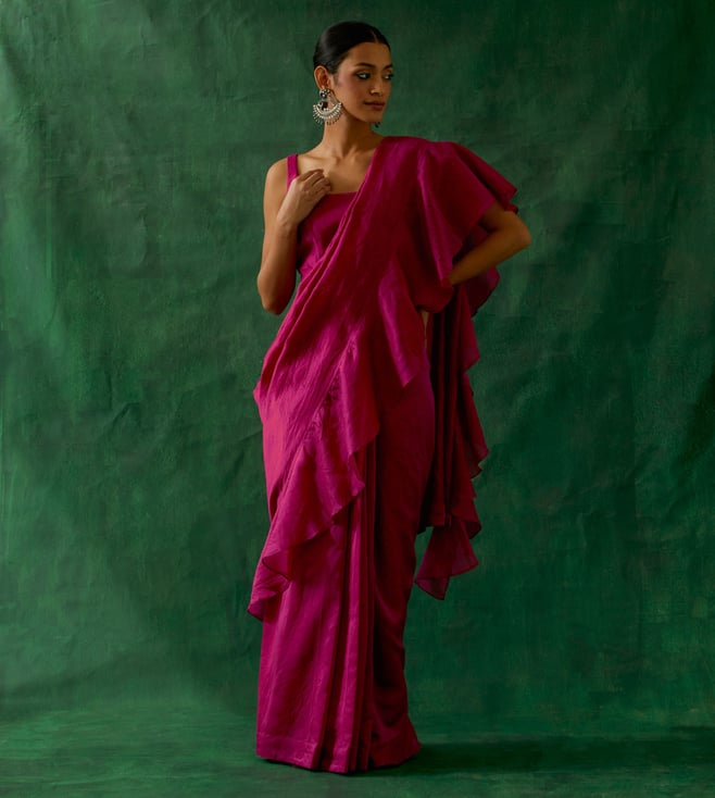 Coordinate Set Ruffled Saree and Blouse in Hot Pink Chanderi Handloom with Gold Zari Belt