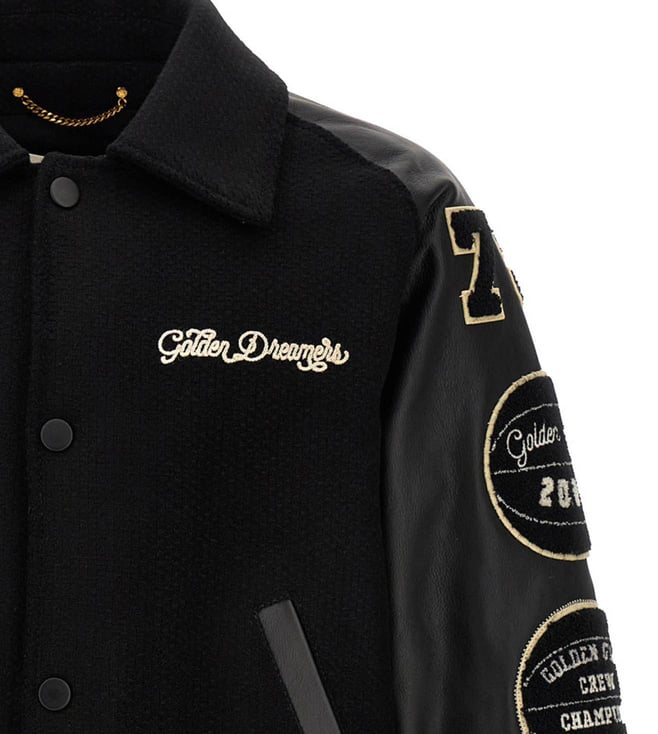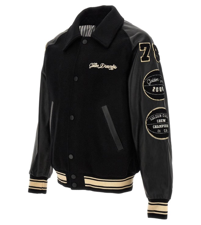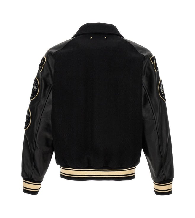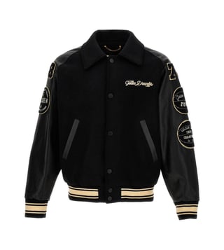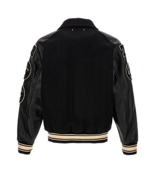 Wool cloth bomber jacket with all-over patches, long leather sleeves with knitted cuffs, pockets, button closure. Products purchased from Darveys are supported exclusively by the warranty/exchange policies of Darveys and its partner boutiques. Brand owners and their channel partners are not responsible for exchange/warranty services for items purchased through Darveys.