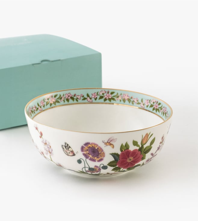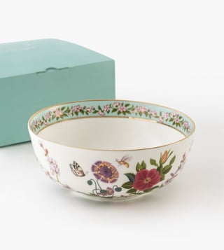 The delicate inner ring of ferns and flowers atop a soft aquamarine base of this serving bowl with an exterior band of hand-drawn floral motifs from a paradise garden. It is rimmed and accented with 24-kt gold. It comes from the Rosabagh collection. It has been made using fine bone China. Disclaimer: All other items in the image are only for display purposes and will not be a part of the delivery content. Product colour may slightly vary due to photographic lighting sources. Country of Origin - India.