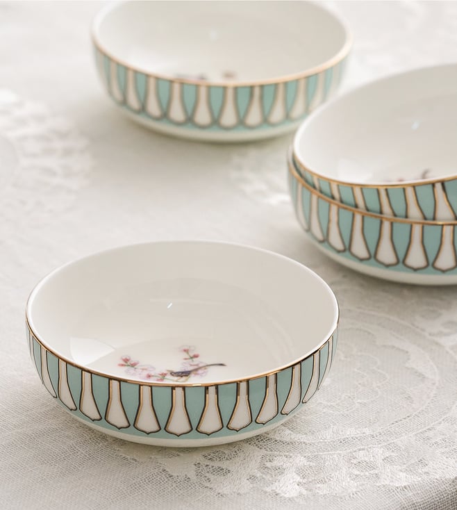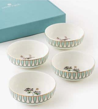 This set of 4 bowls with a delicate architectural design encircling the outer rim, while verdant blossoms, birds and butterflies decorate the interior, is evocative of a Mughal paradise garden. Uniting two designs, Rosabagh with leitmotifs is inspired by a vintage Persian miniature, and the enchanting garden life of the Mughals. It is hand decorated with artwork decals and 24 carat gold detailing. This Rosabagh essential has been crafted using fine bone china. Disclaimer: Product colour may slightly vary due to photographic lighting sources. Country of Origin - India.