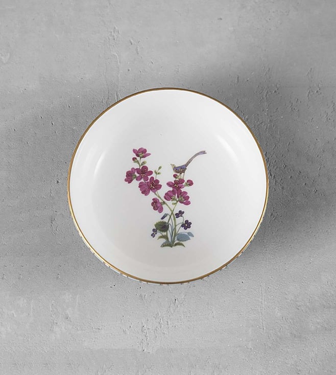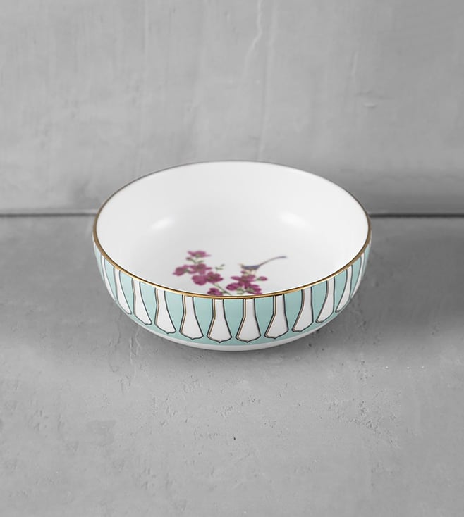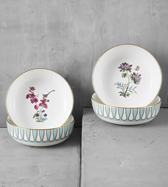 This set of 4 bowls with a delicate architectural design encircling the outer rim, while verdant blossoms, birds and butterflies decorate the interior, is evocative of a Mughal paradise garden. Uniting two designs, Rosabagh with leitmotifs is inspired by a vintage Persian miniature, and the enchanting garden life of the Mughals. It is hand decorated with artwork decals and 24 carat gold detailing. This Rosabagh essential has been crafted using fine bone china. Disclaimer: Product colour may slightly vary due to photographic lighting sources. Country of Origin - India.