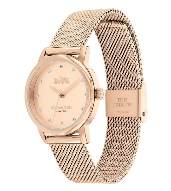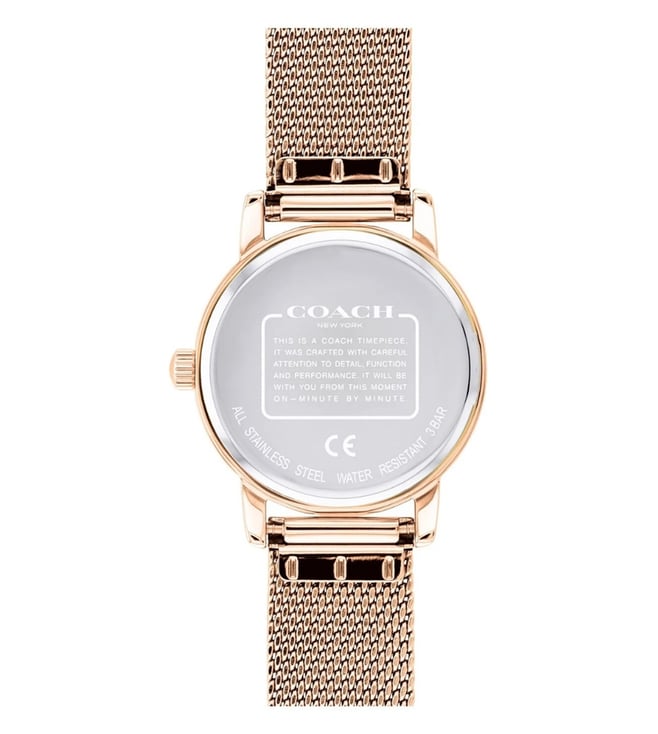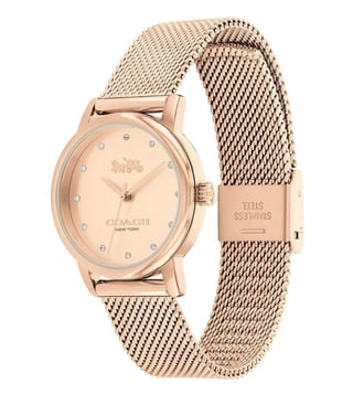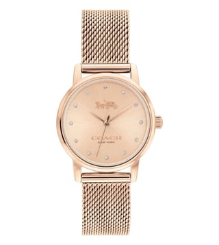 Add a stylish dimension to your look by wearing this women watch from the grand collection by Coach. The gold round dial is nestled by a mineral glass. It vaunts analog and a crown for time adjustment. The stainless steel strap exudes a rose gold hue that accentuates the look of the timepiece.