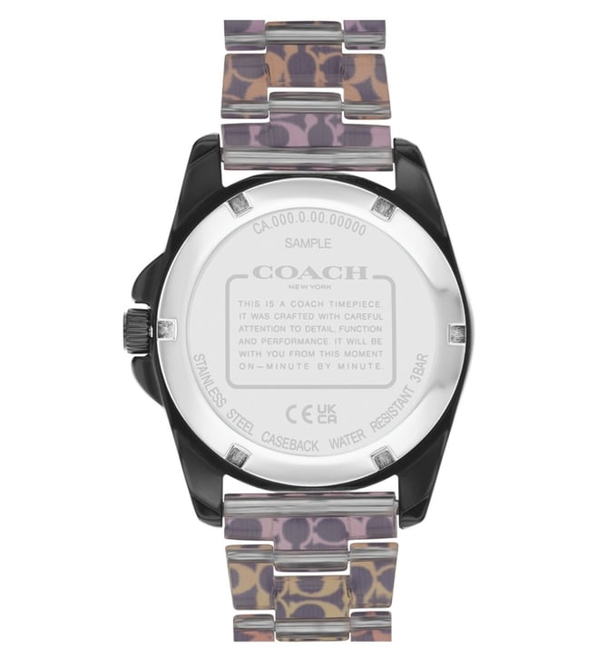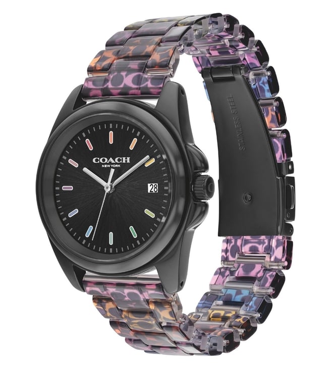 Amaze everyone around you by wearing this women watch from the greyson collection by Coach. The black round dial is protected by a mineral glass. It features analog and a crown for time adjustment. The stainless steel strap comes in a multi hue that further elevates the look of the timekeeper.
