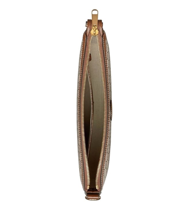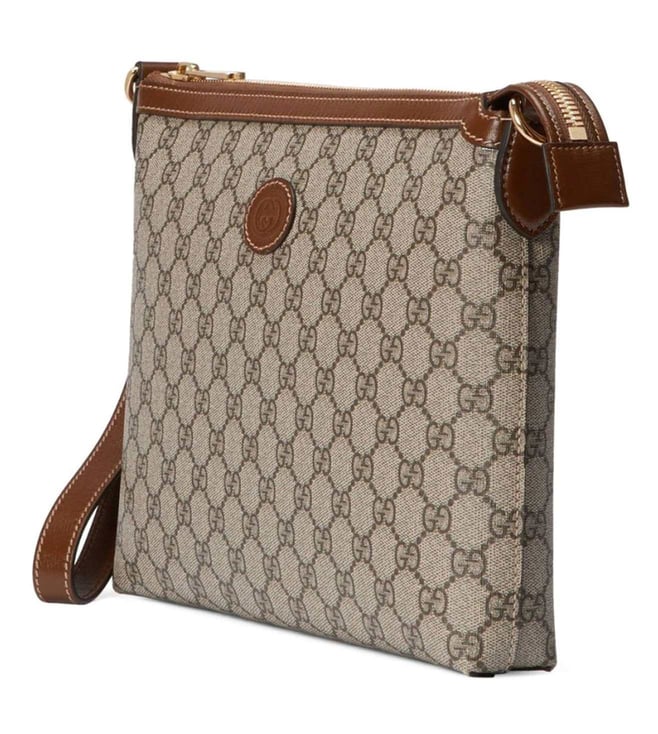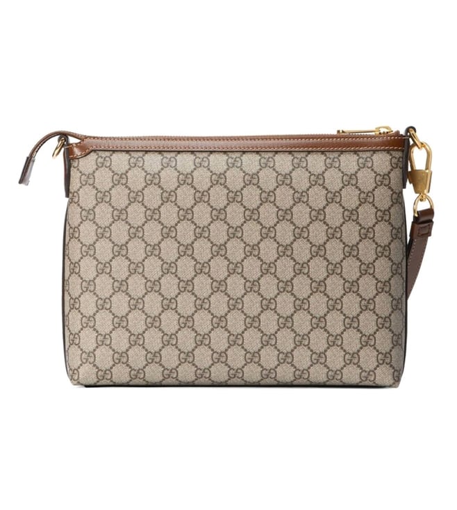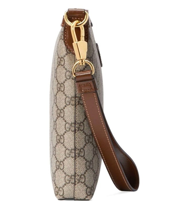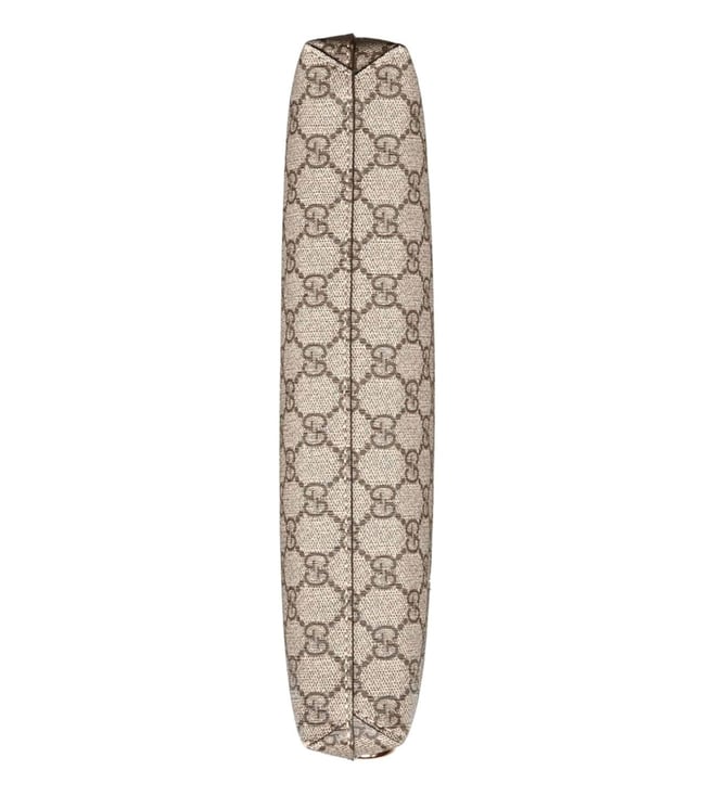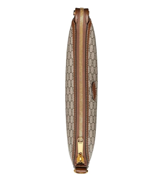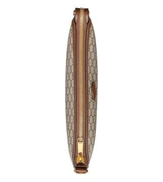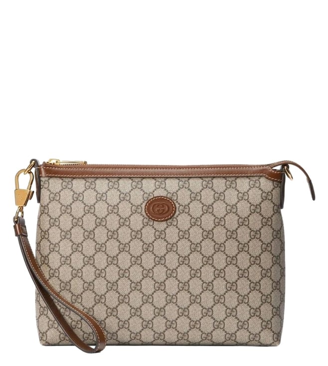 Interlocking g-print clutch bag from gucci featuring beige, gg supreme canvas, leather trim, signature interlocking g logo, top zip fastening, main compartment and detachable wrist strap.