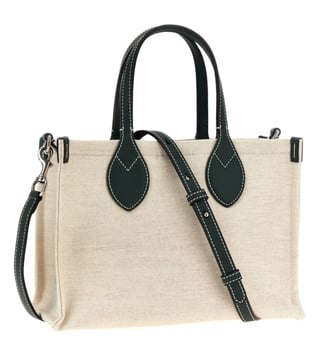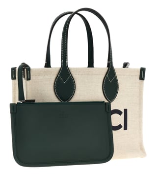 Beige logo mini tote, open top, 1 compartment, removable zip pouch, front logo, dual carry handles with removable adjustable shoulder strap. Products purchased from Darveys are supported exclusively by the warranty/exchange policies of Darveys and its partner boutiques. Brand owners and their channel partners are not responsible for exchange/warranty services for items purchased through Darveys.