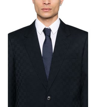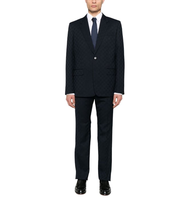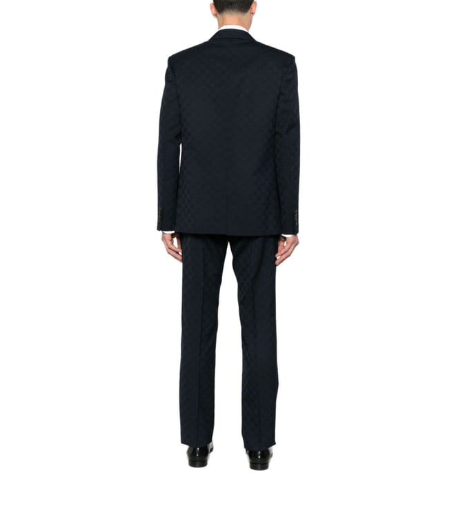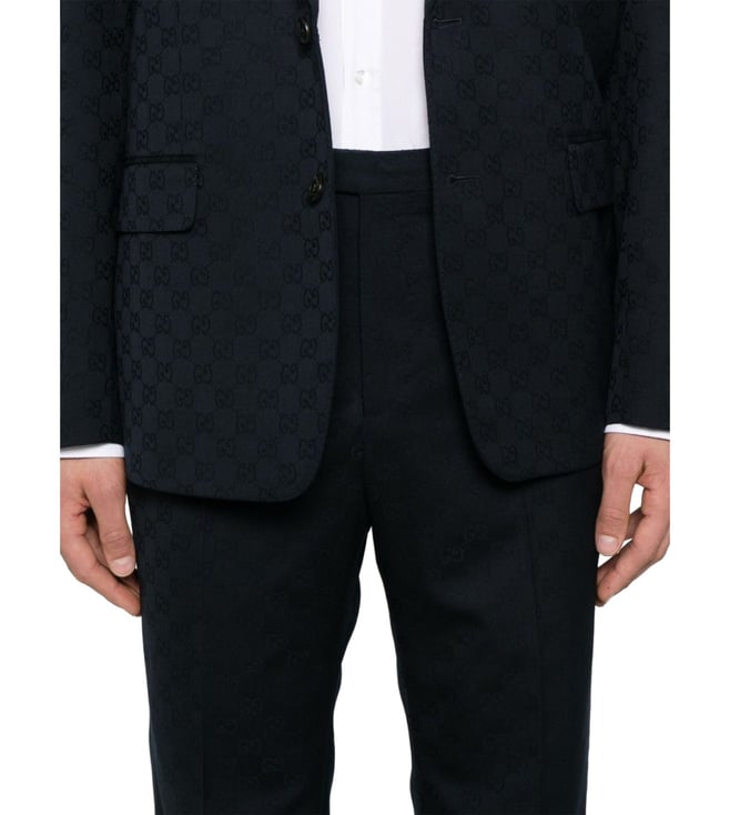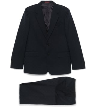 Elevate your style with the Gucci Black Design Tailored Fit Suit. Single-breasted jacket with full canvas construction, notch lapel, chest pocket, two front pockets, rear vent and full lining straight leg trousers with belt loops, two front pockets, two back pockets and hook and zip closure. Products purchased from Darveys are supported exclusively by the warranty/exchange policies of Darveys and its partner boutiques. Brand owners and their channel partners are not responsible for exchange/warranty services for items purchased through Darveys.