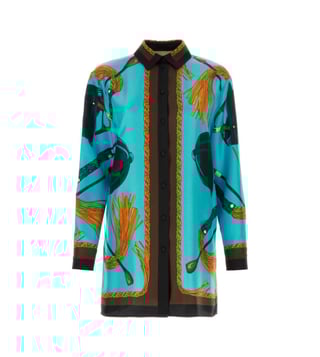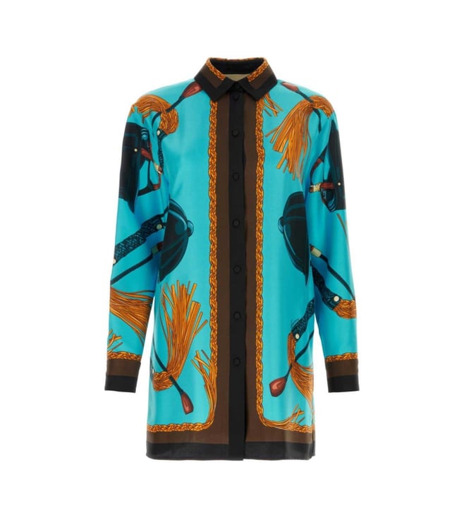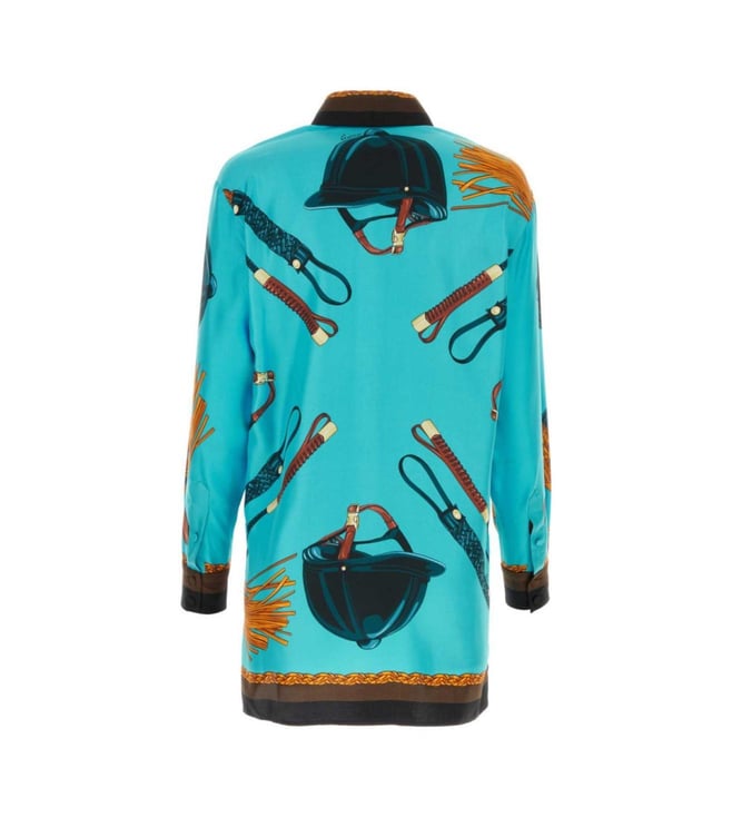 Elevate your wardrobe with this exquisite blue casual shirt, adorned with an eye-catching printed pattern. Crafted from 100% silk, it offers a luxurious feel and a graceful drape. The long sleeves and classic shirt collar add a touch of sophistication, making it perfect for both day and night. Designed for the modern woman, this shirt features a seamless closure, ensuring a sleek silhouette. Whether paired with jeans or a skirt, it promises to be a versatile and stylish addition to your collection.