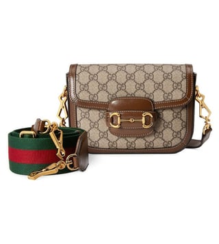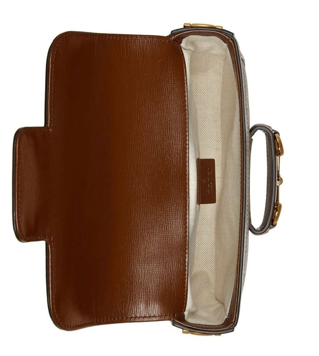 Beige leather/canvas 1955 horsebit mini bag from gucci featuring signature horsebit detail, classic gg canvas, adjustable detachable shoulder strap, main compartment and signature web detail strap option. Products purchased from Darveys are supported exclusively by the warranty/exchange policies of Darveys and its partner boutiques. Brand owners and their channel partners are not responsible for exchange/warranty services for items purchased through Darveys.