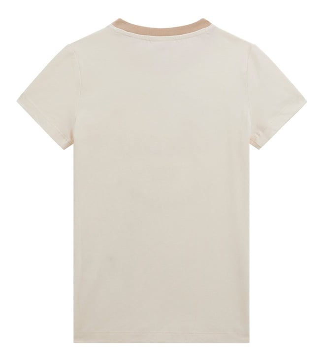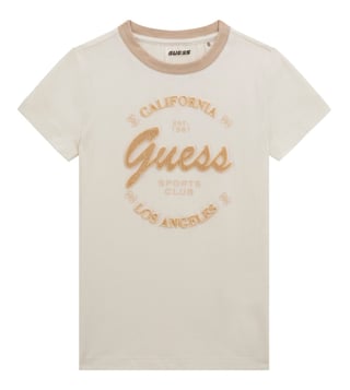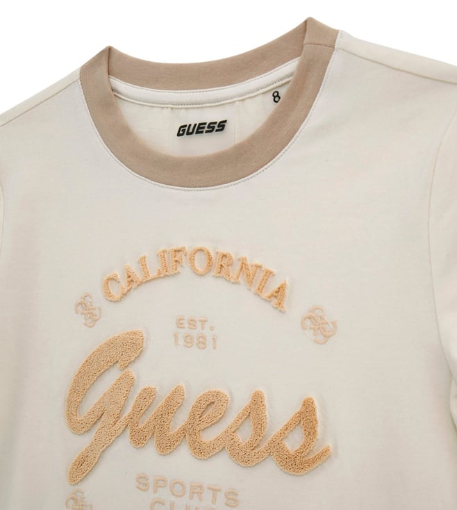 Elevate your little ones wardrobe with the Guess kids beige ss stretch jersey logo t-shirt. Crafted from soft cotton, this casual tee features a round neck and short sleeves for all-day comfort and style. The regular fit ensures a relaxed look, while the iconic Guess logo adds a touch of designer flair. Perfect for everyday wear, this versatile t-shirt is a must-have addition to any fashion-forward kids collection. Upgrade their outfits effortlessly with this trendy and comfortable piece.