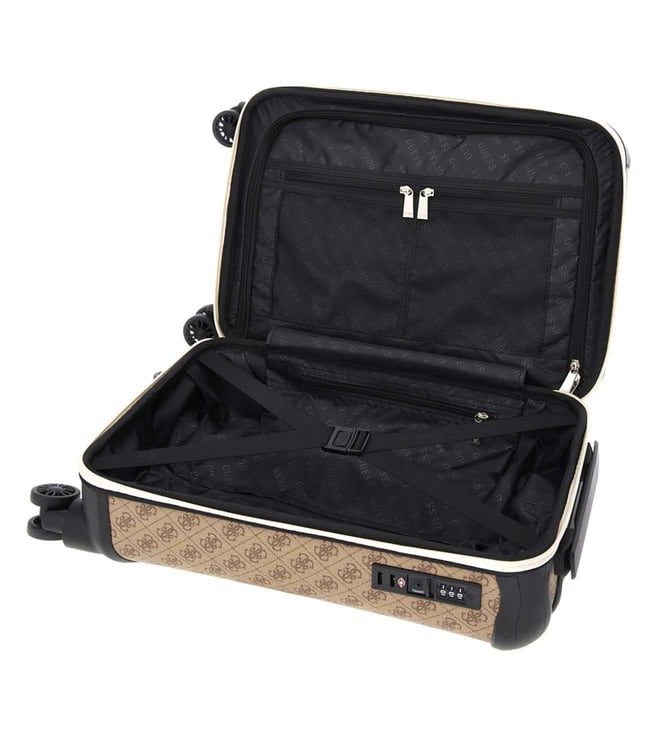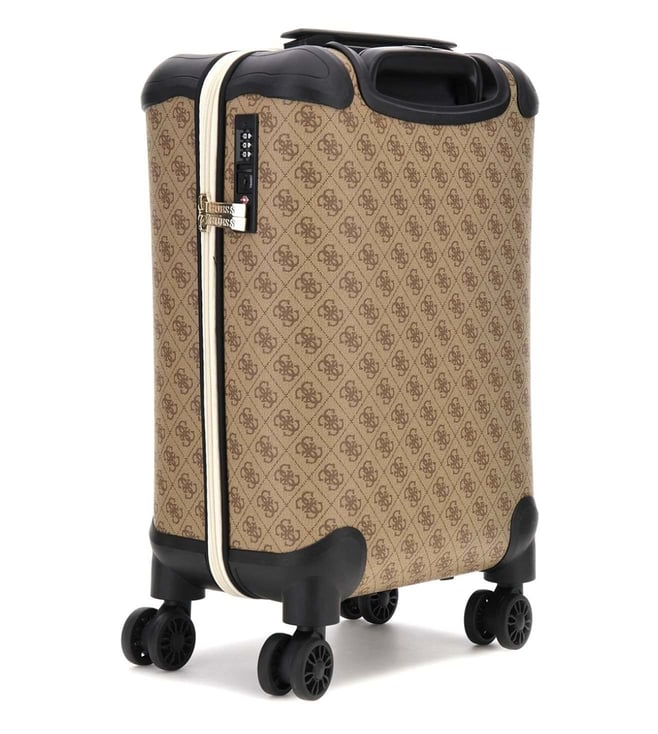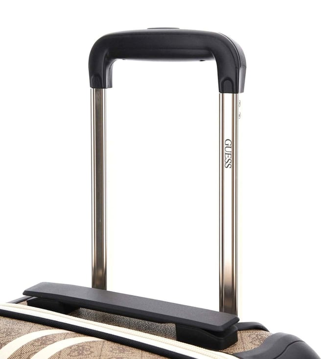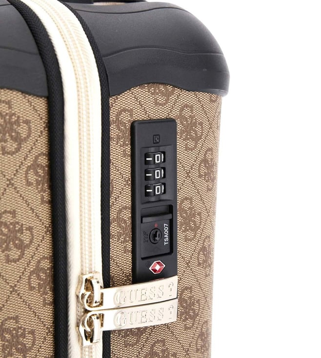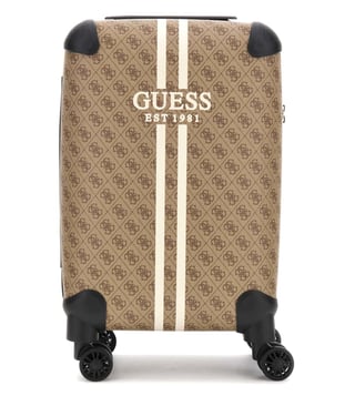 Add a quotient of style to your casual attire by carrying this women cabin trolley from GUESS. It is fashioned from premium quality PU and is sure to last for a long time. This cabin trolley with a logo pattern flaunts compartments and pockets that can accommodate your valuables easily. This beige cabin trolley comes with a telescopic handle strap and a TSA lock closure that makes sure your essentials are safe and secure.
