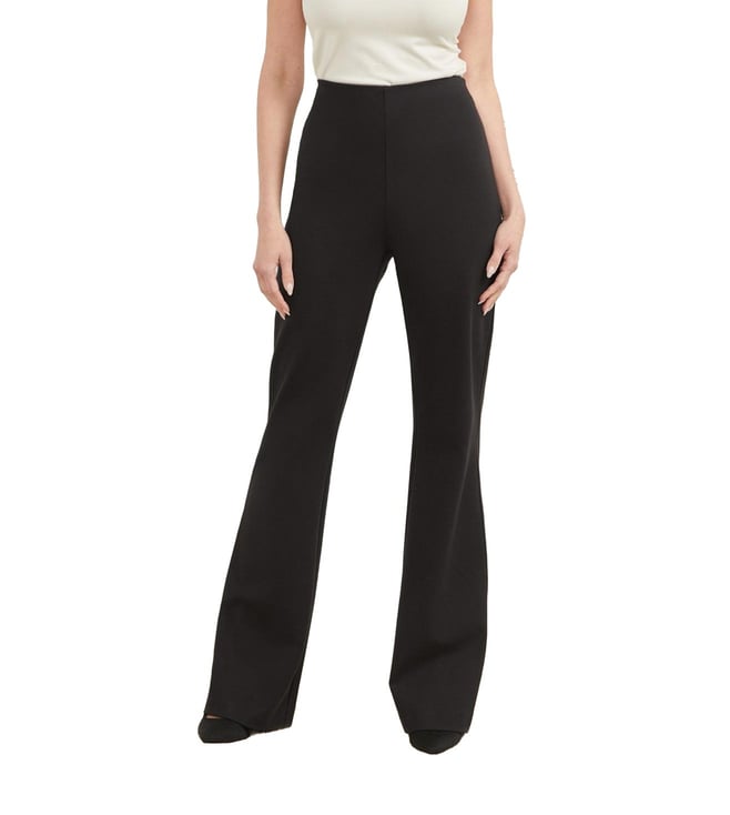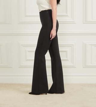 Discover elegance and comfort with our black flat front formal trousers for women. Designed with a regular fit, these trousers offer a sleek silhouette perfect for any professional setting. The high-rise waist enhances your natural shape, while the side concealed zip closure ensures a seamless look. Crafted from a luxurious viscose blend fabric, these trousers provide a soft feel and lasting durability. The solid pattern adds a touch of sophistication, making them a versatile addition to your wardrobe.