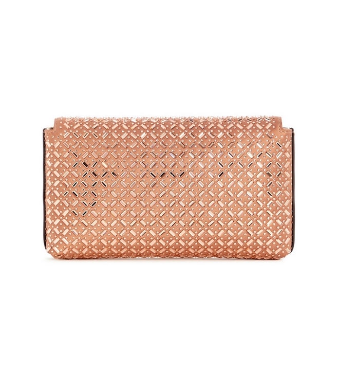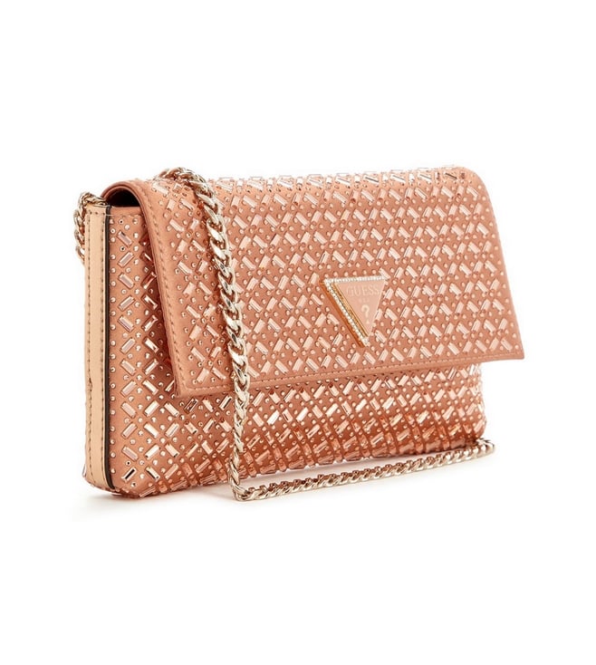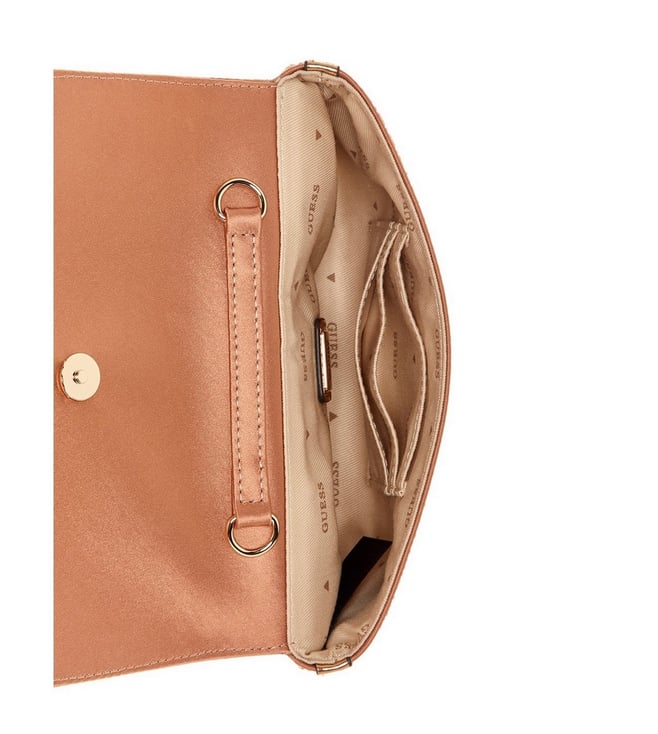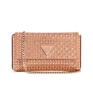 The Guess Zarina Flap Clutch is a chic and sophisticated accessory that will elevate any outfit. Crafted from luxurious polyester, this clutch features a stunning bronze embellished design that adds a touch of glamour. The flap closure secures your essentials, while the spacious interior provides ample room for your phone, wallet, and other necessities. The chain strap allows for hands-free carrying, making it perfect for evening events or a night out on the town.