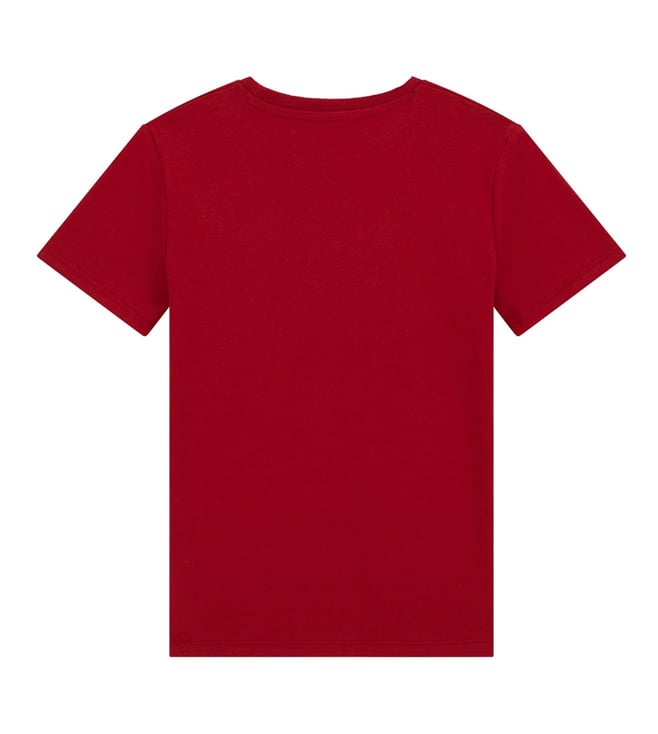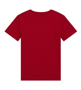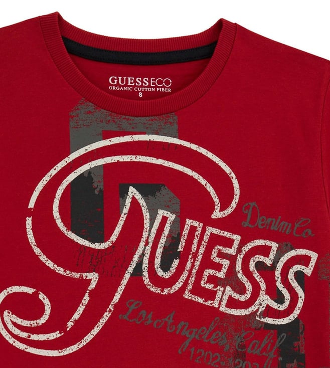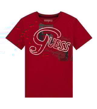 Elevate your childs casual wardrobe with the Guess kids chilli red ss stream jersey printed t-shirt. Crafted from soft cotton, this regular fit tee features a classic round neck and short sleeves for ultimate comfort. The eye-catching print adds a playful touch to any outfit, making it perfect for everyday wear. Whether theyre running around the playground or lounging at home, this versatile t-shirt is sure to become a favorite in their closet. Upgrade their style with Guess kids today.