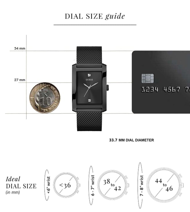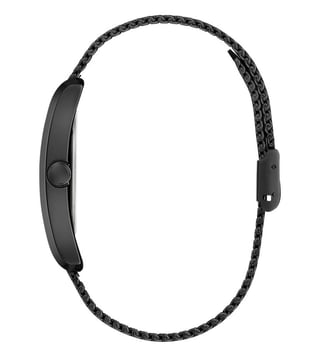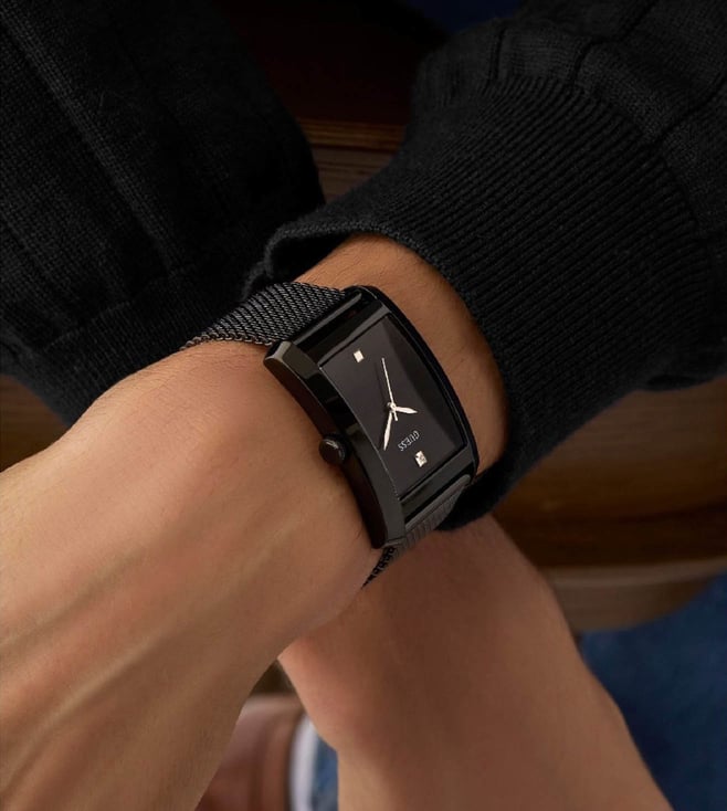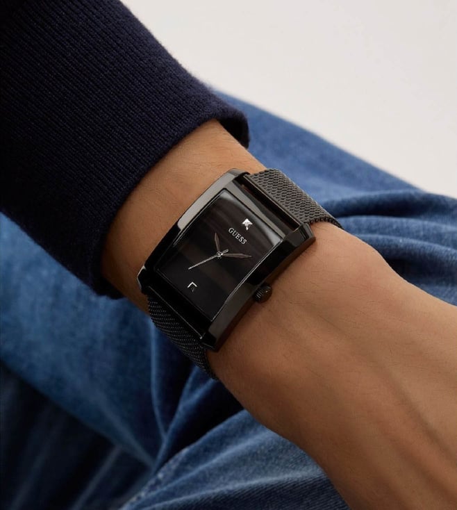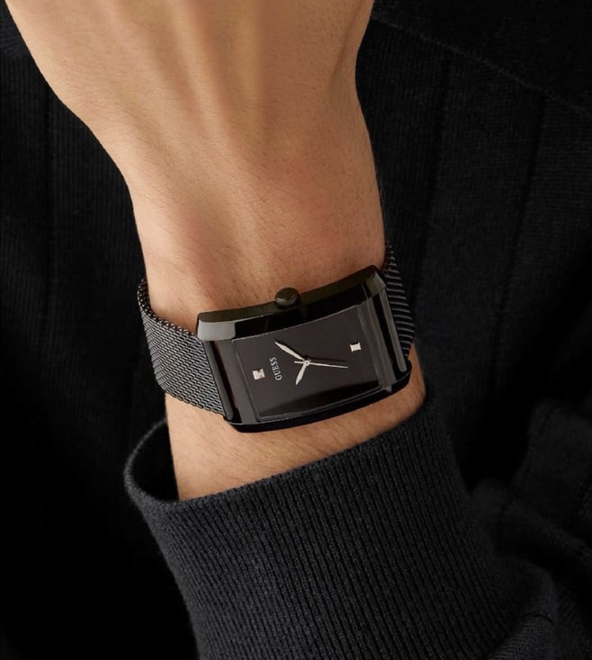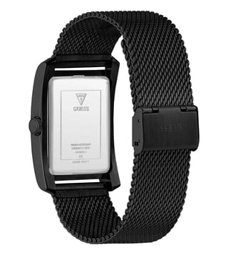 Add the perfect finishing touch to your casual look with this men's analog watch from the Clyde collection by Guess. Its stainless steel strap showcases a black hue that uplifts the look of the watch. Housed in a 33.7 mm case, the black rectangular dial is protected by a mineral glass. It showcases plain three hands. Furthermore, it is complemented with a hook buckle clasp that ensures a secure fit on the wrist.