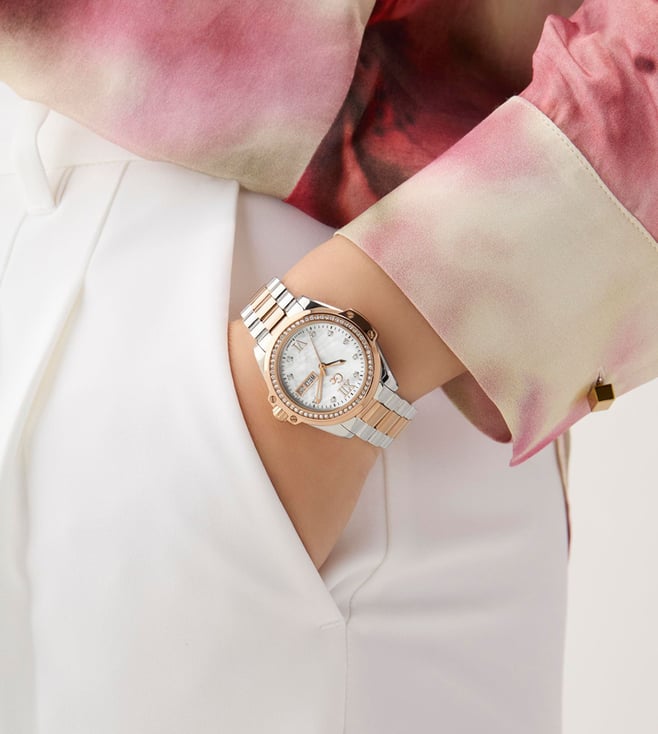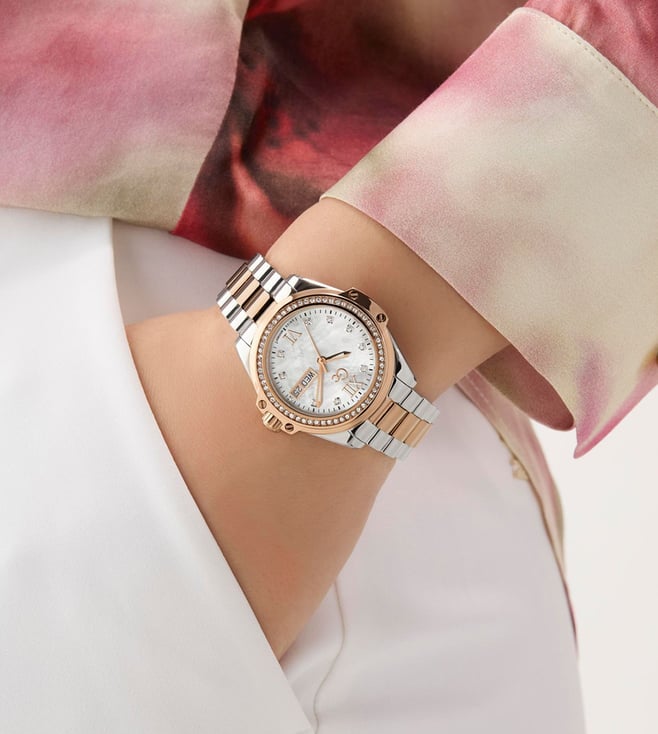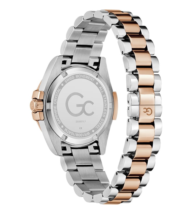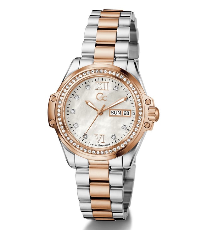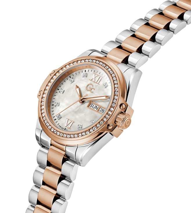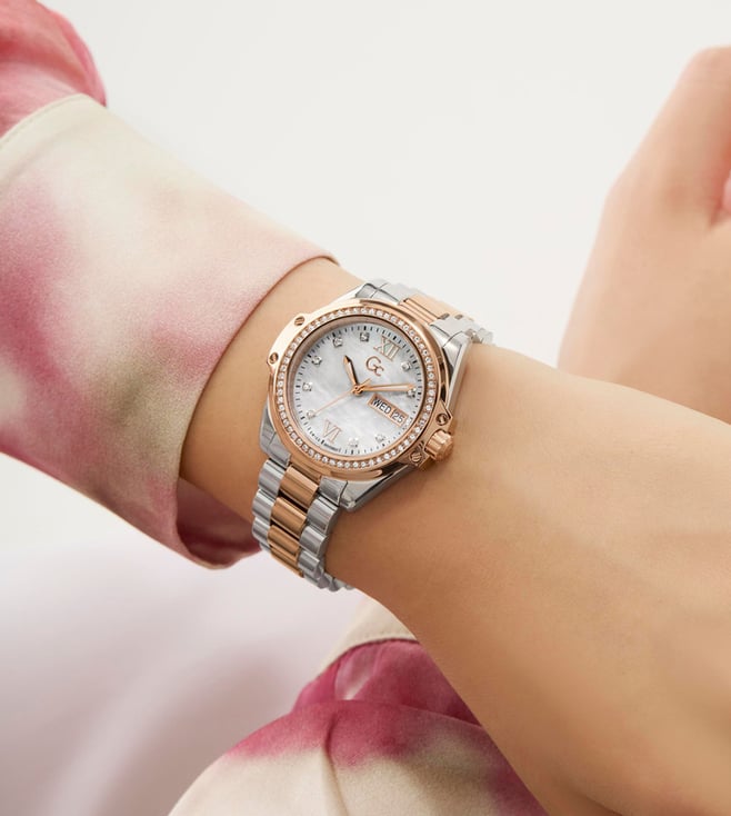 Make your mark with the Gc Bolt Lady, where timeless elegance meets distinctive design. This refined 34mm timepiece blends silver with rose gold tones, featuring the collections emblematic wings and signature screws. The luxurious eco friendly white mother of pearl dial creates a stunning backdrop for the day/date display at 3 o'clock. Delicate crystals adorn the top ring, adding a touch of brilliance, while the elevated curved bracelet ensures both comfort and sophistication the perfect expression of feminine strength and style.
