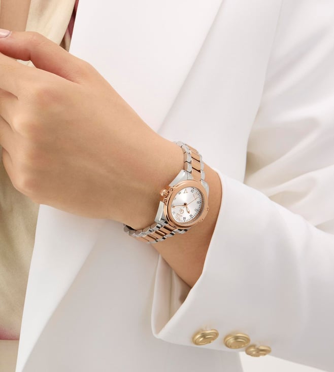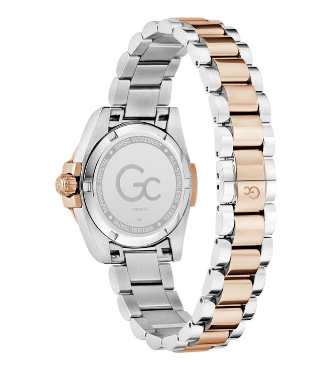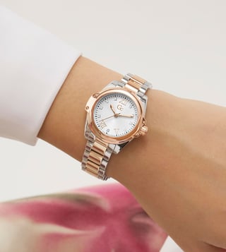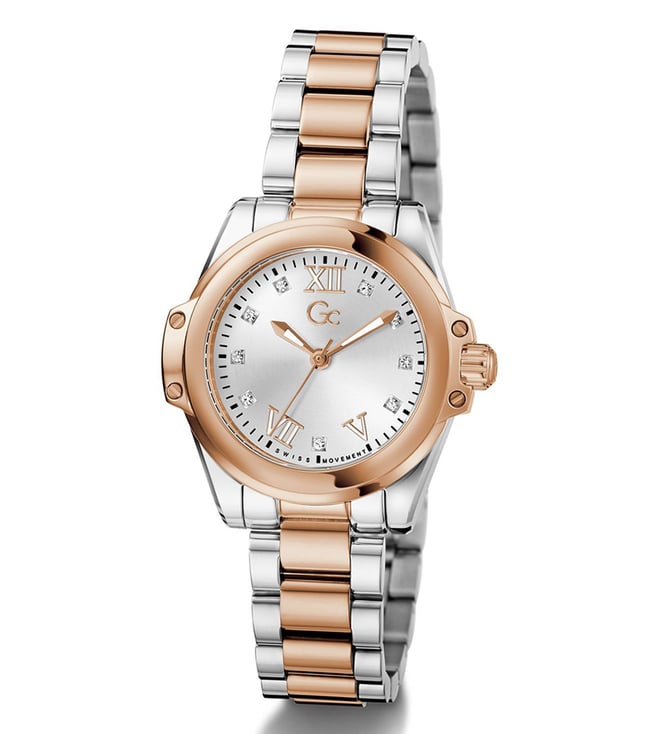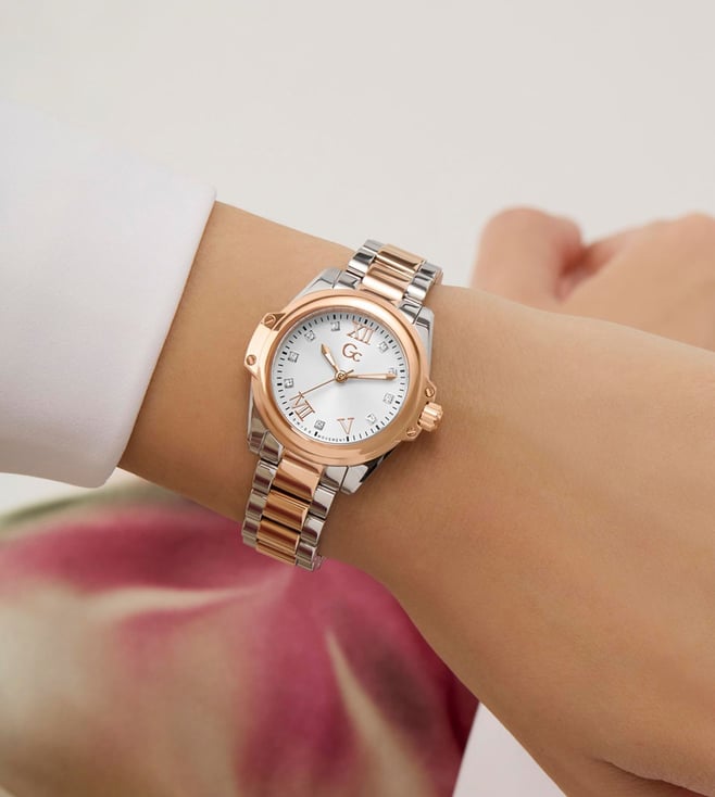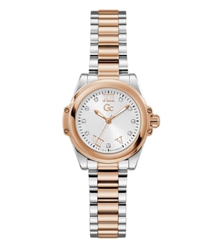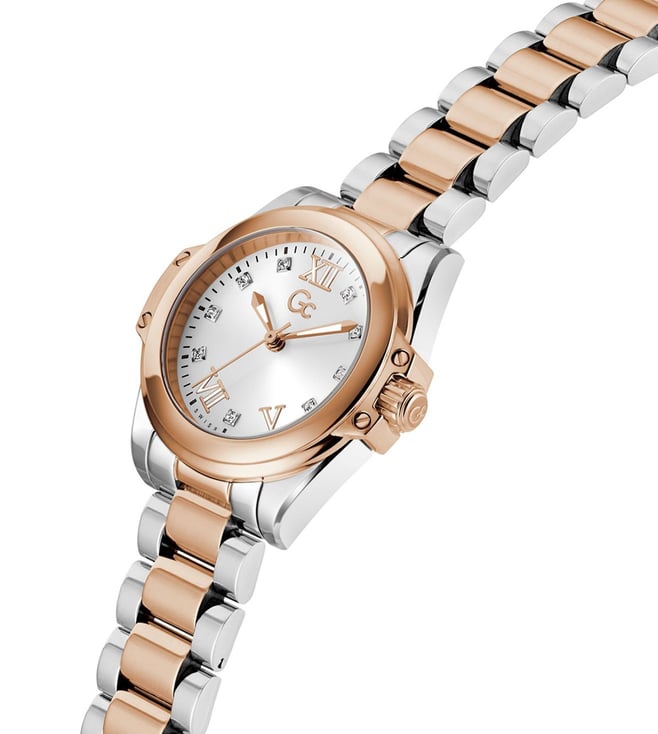 Embrace the elegance of the sophisticated Gc Bolt Lady Mini, a perfect embodiment of the trending mini timepiece aesthetic. This petite 30mm watch combines silver with rose gold tones, showcasing the collections signature wings and distinctive screws. The white sunray dial creates a captivating play of light and the elevated curved bracelet delivers both refinement and comfort, creating a versatile accessory that transitions effortlessly from day to evening.