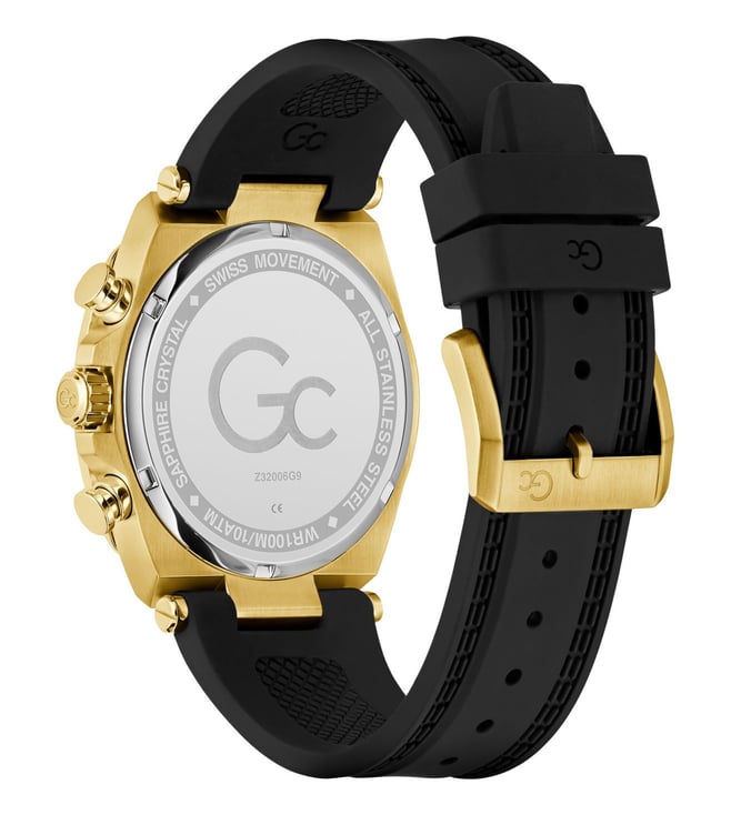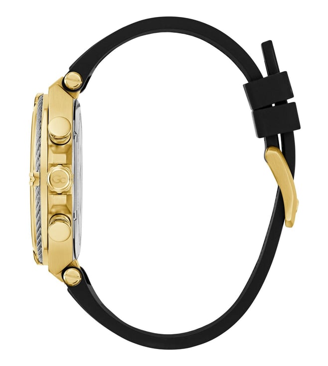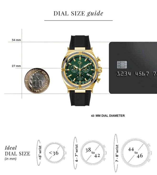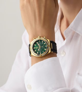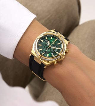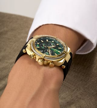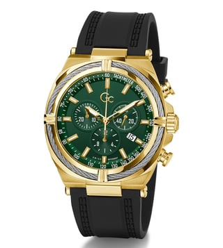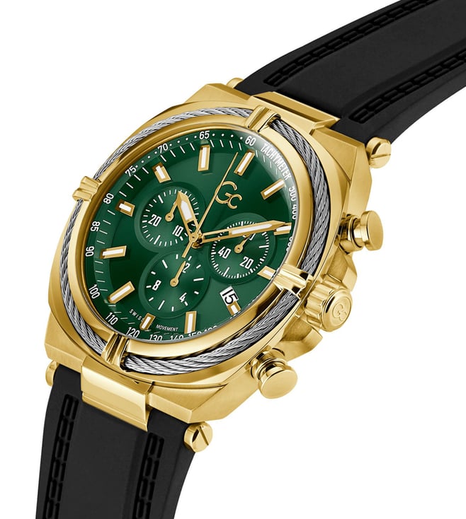 With its unique cable wire on top ring the Gc IronClass and its 43mm cushion case and chronograph movement shows a mix of coolness and sophistication. This yellow gold PVD with silver wire version hosts an emerald green dial and features an elegant black silicone strap.