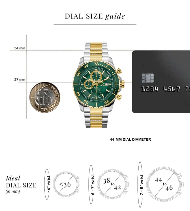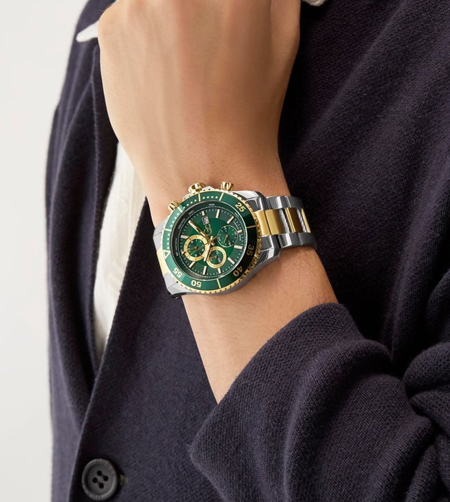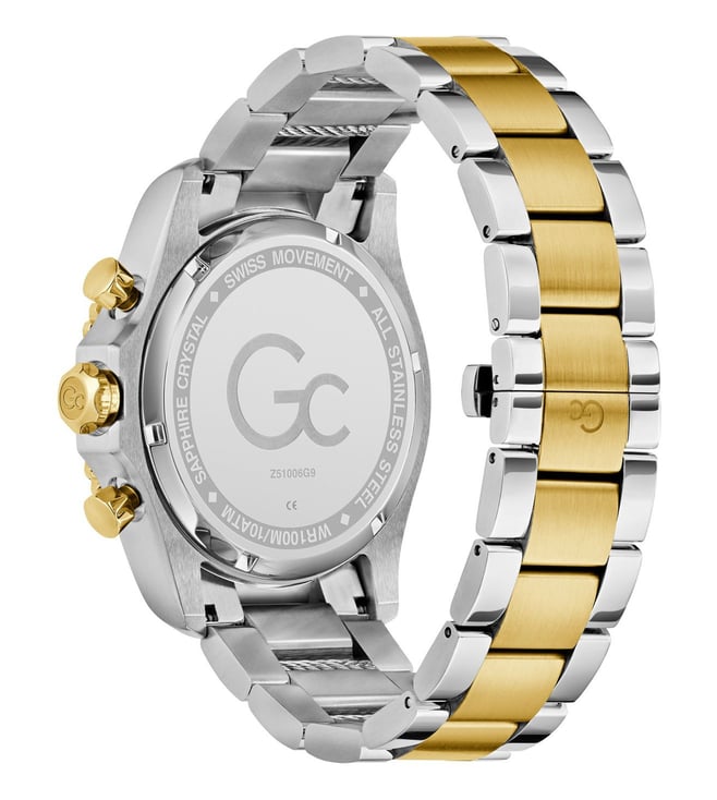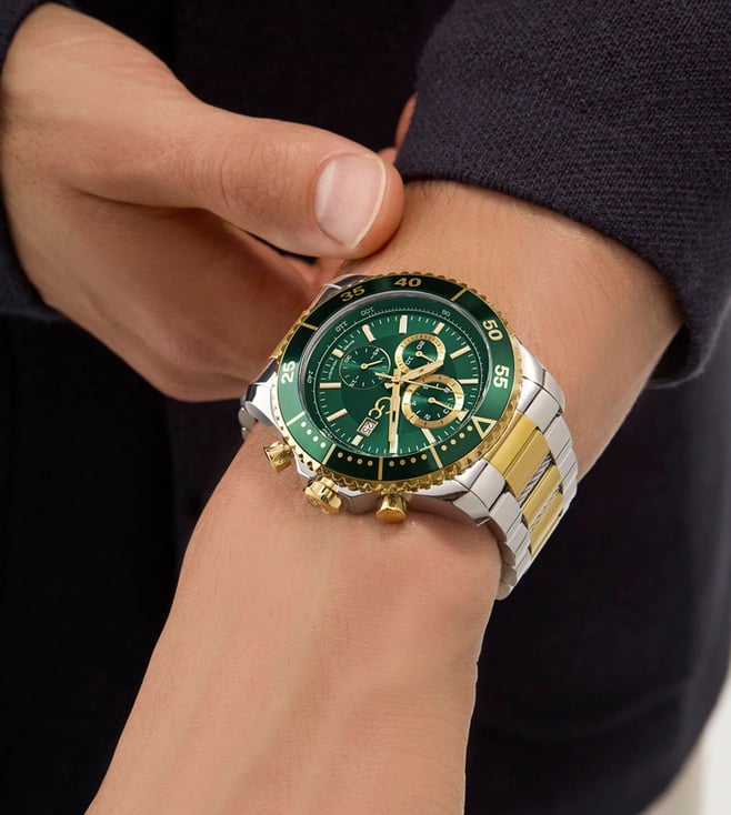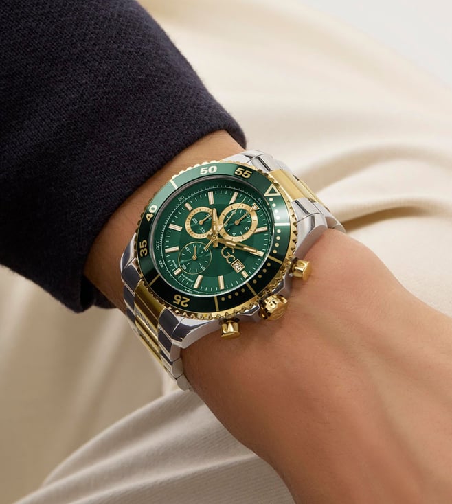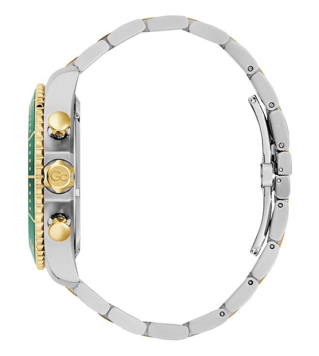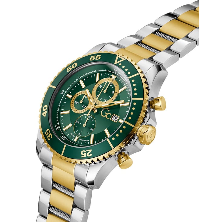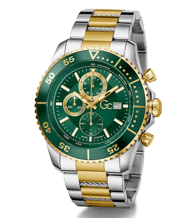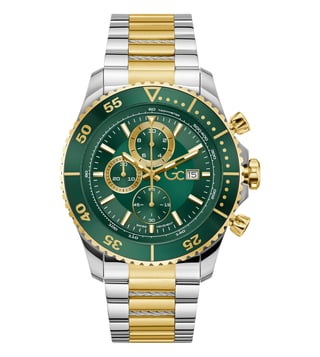 Stand out boldly with the spectacular Gc SpeedRacer diver look chronograph. This impressive 44mm timepiece combines a striking silver case with yellow gold tone accents, complemented by a green rotating top ring and matching two tone bracelet with subtle cable details. The stunning emerald green dial features distinctive asymmetrical sub dials, creating a perfect balance of sporty sophistication and technical prowess. A commanding presence for those who appreciate exceptional design with unmistakable character.