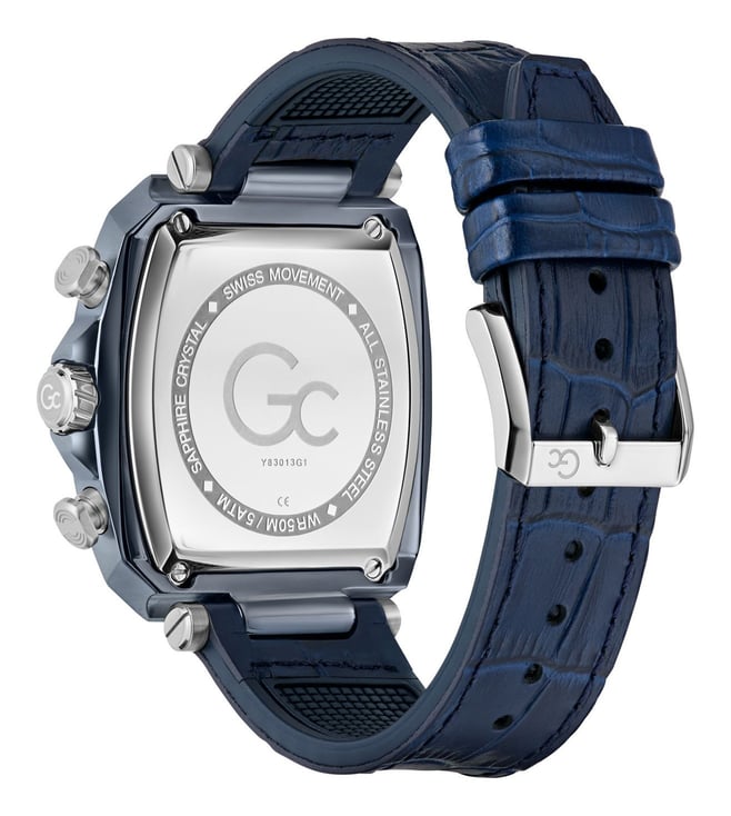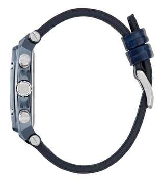 Square the circle with this tonneau chronograph. This style is highly detailed thanks to an off white square pattern dial set off by stone blue details, a stylish stone blue PVD bezel with recognizable screw design details, on a croco patterned blue leather coated silicone for maximum comfort.