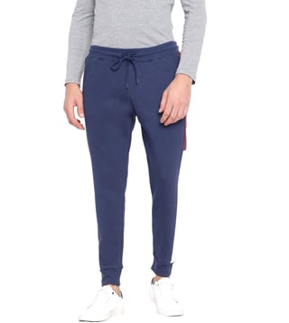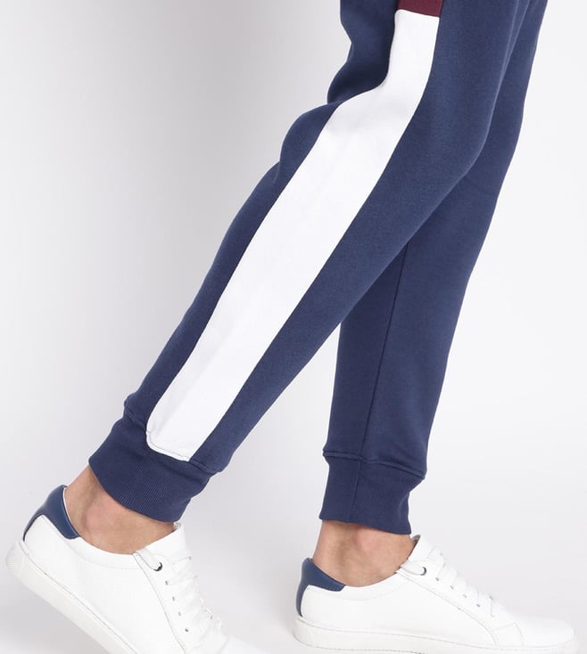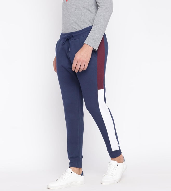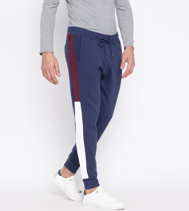 Elevate your style with these dark blue joggers featuring a striking colorblocked pattern. Designed for men, they offer a comfortable fit with a drawstring closure. Crafted from a premium cotton blend fabric, these joggers ensure breathability and durability, making them perfect for both casual outings and active days.