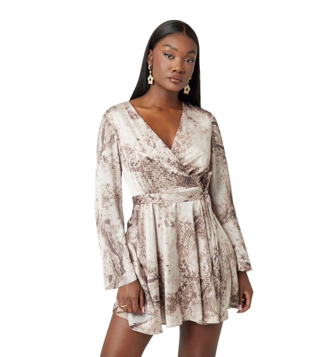 Brown Printed V-Neck Full Sleeve Wrap Dress