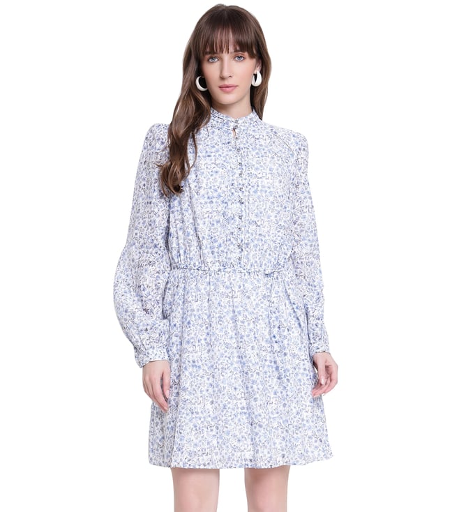 Women White & Blue Printed Mock Neck Dress