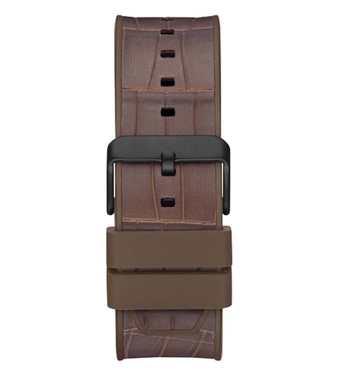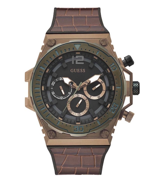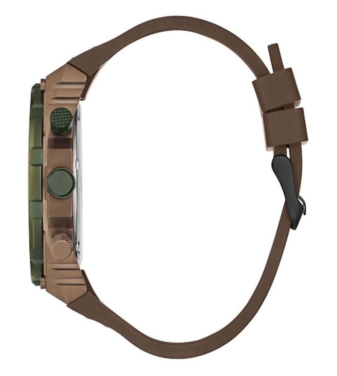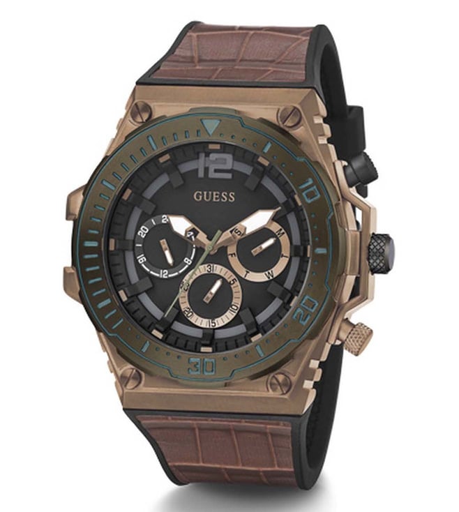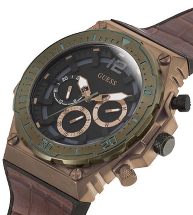 Give your wrist the perfect blend of style and comfort by wearing this stylish men's analog watch from the Carryover Venture collection by Guess. It features a multifunctional quartz movement. It has a round dial, a buckle clasp and is water-resistant at 30 m.