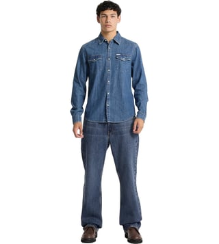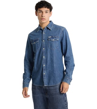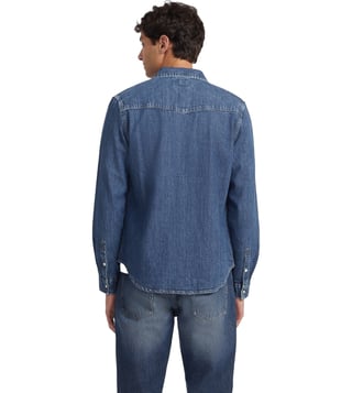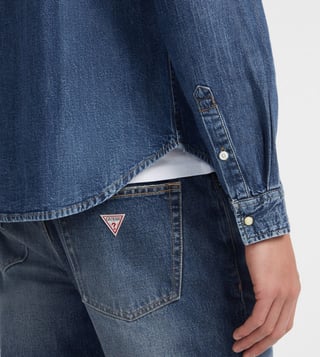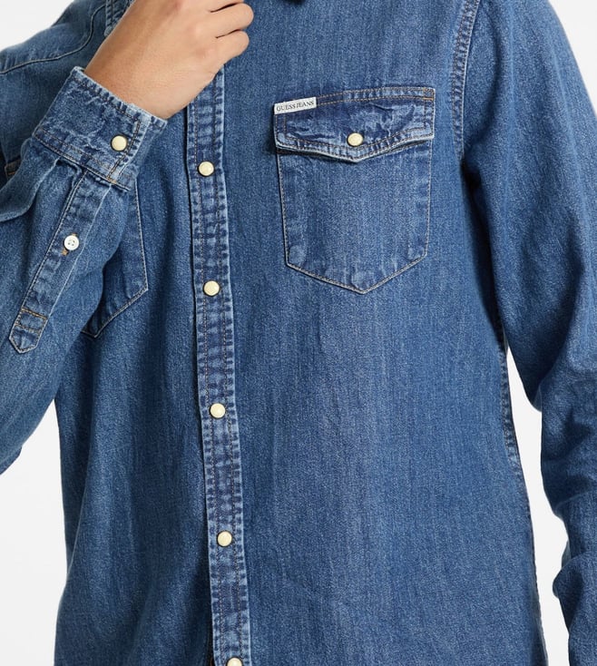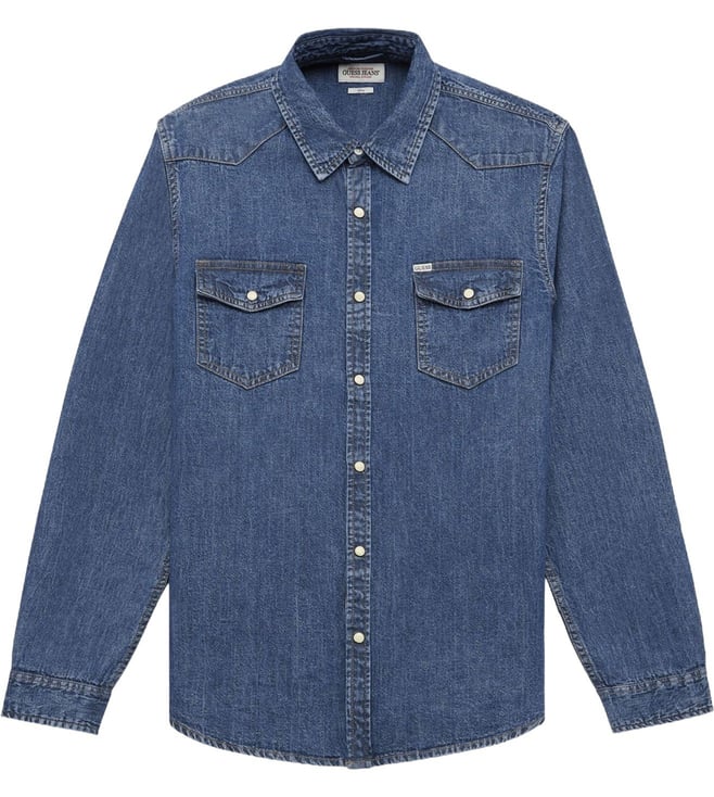 Elevate your casual style with the Guess Jeans Blue Slim Fit Denim Shirt. Crafted from 100 percent cotton, this shirt offers a comfortable and breathable fit, perfect for everyday wear. The slim fit design provides a modern and flattering silhouette, while the classic blue color adds a versatile touch to your wardrobe. Whether you are dressing up for a night out or keeping it casual on the weekend, this denim shirt is a must-have staple for any fashion-forward individual.