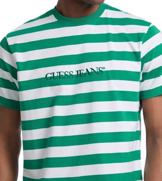 Magnify your wardrobe with this white and green leaf regular fit t-shirt from Guess Jeans. Tailored to sartorial perfection from premium quality fabric, it assures a soft and soothing touch against the skin. The round neck adds to its appeal. Exuding short sleeves, it is sure to fetch you compliments from all. It emanates a striped pattern which makes it a unique choice.