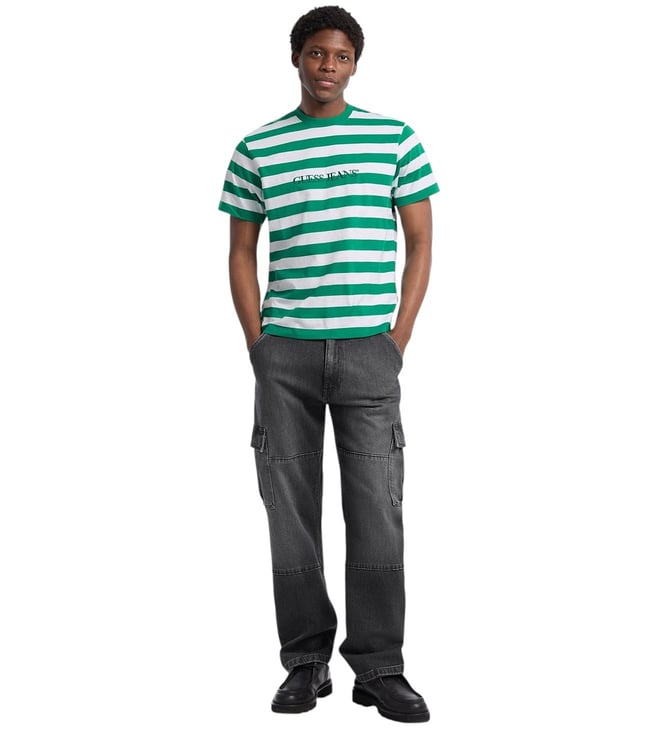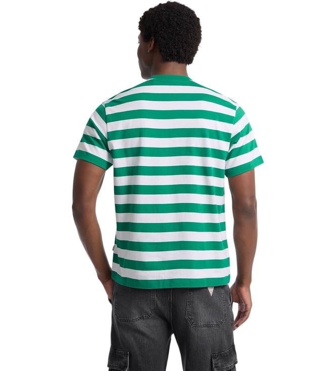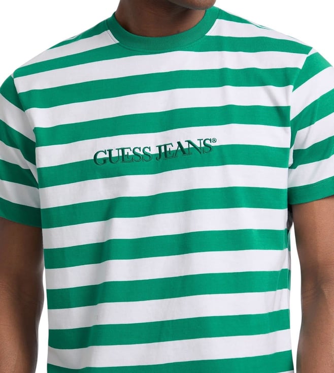 Guess Jeans YD White and Green Leaf Regular Fit Striped T-Shirt
