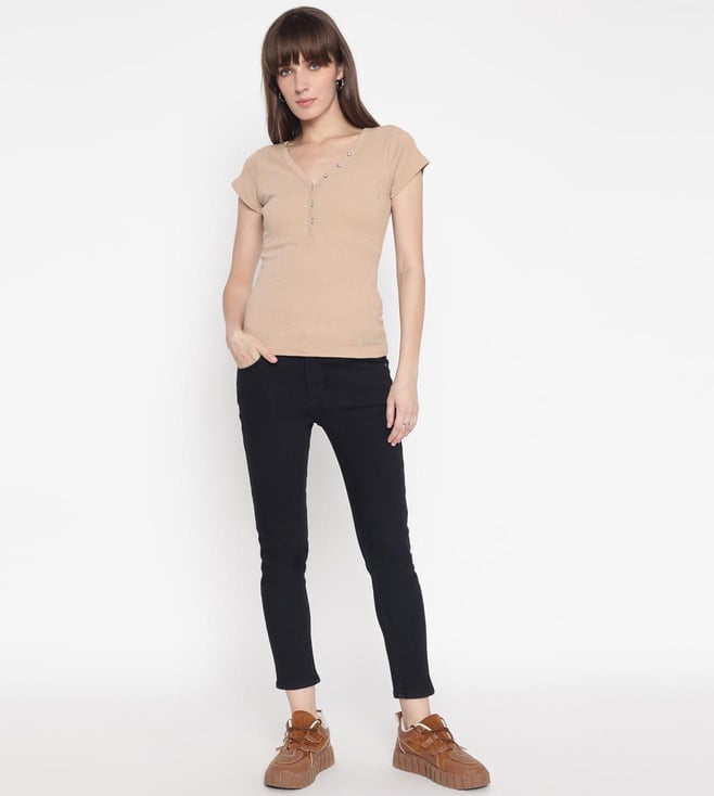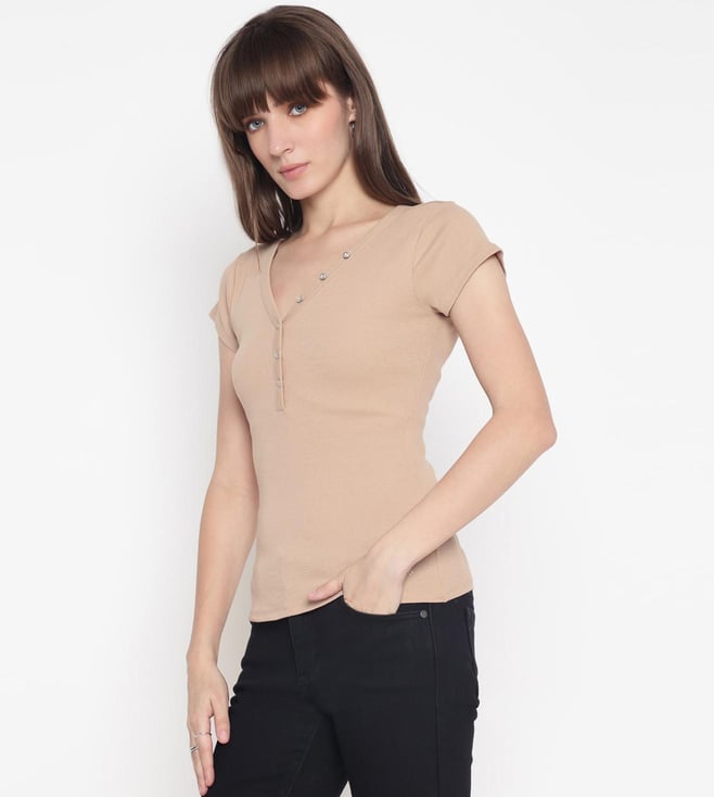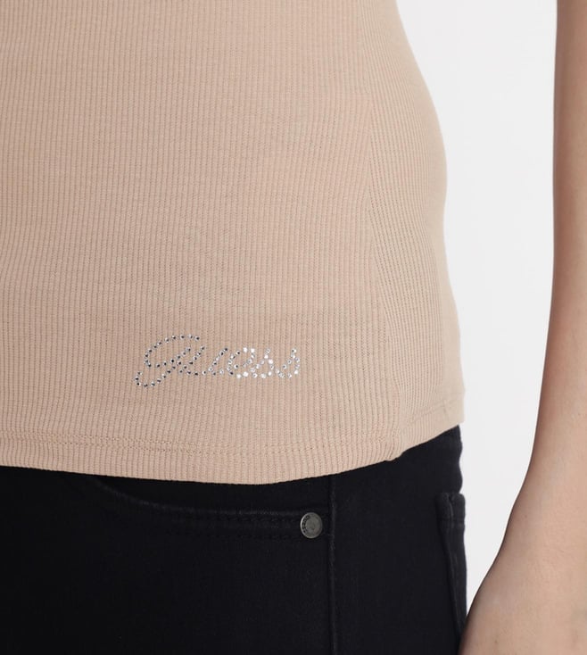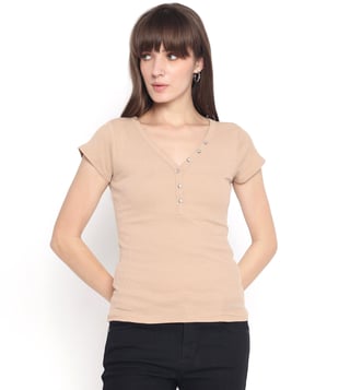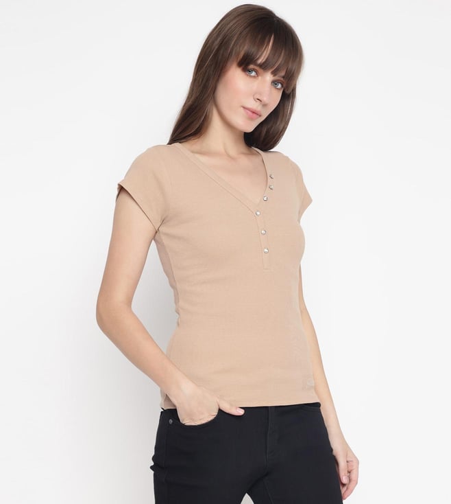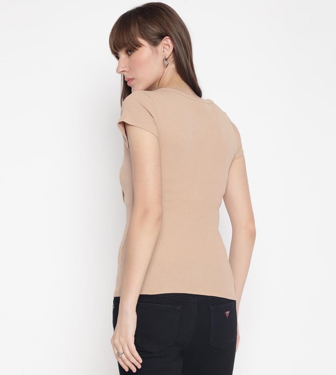 Guess Khaki Ribbed V-Neck Short Sleeve Top