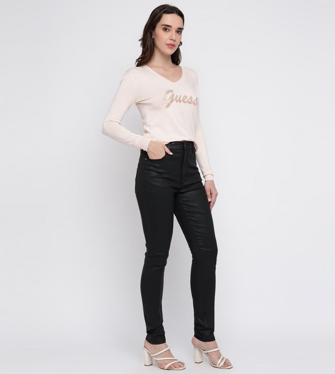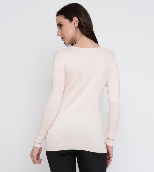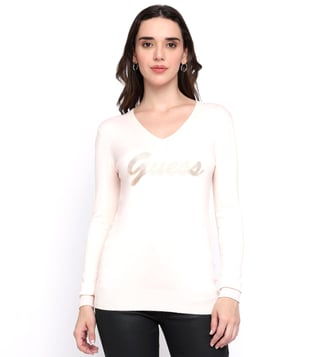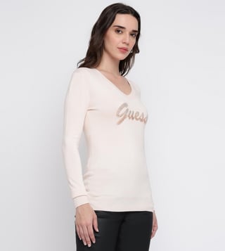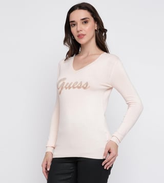 Guess Light Pink Embellished V-Neck Full Sleeve Sweater