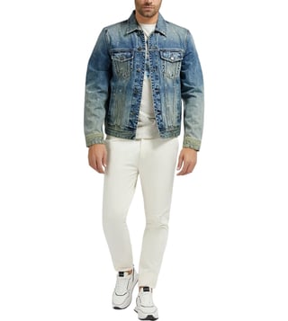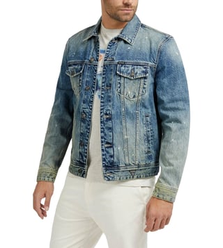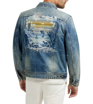 Guess Men's Blue Cotton Embroidered Regular Fit Collared Neck Full Sleeve Denim Jacket
