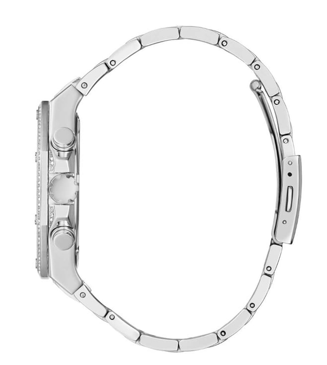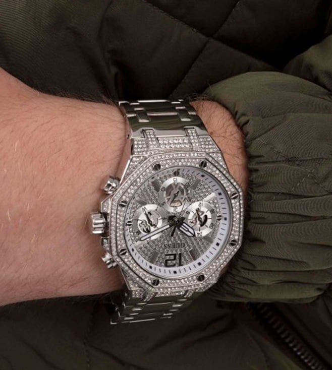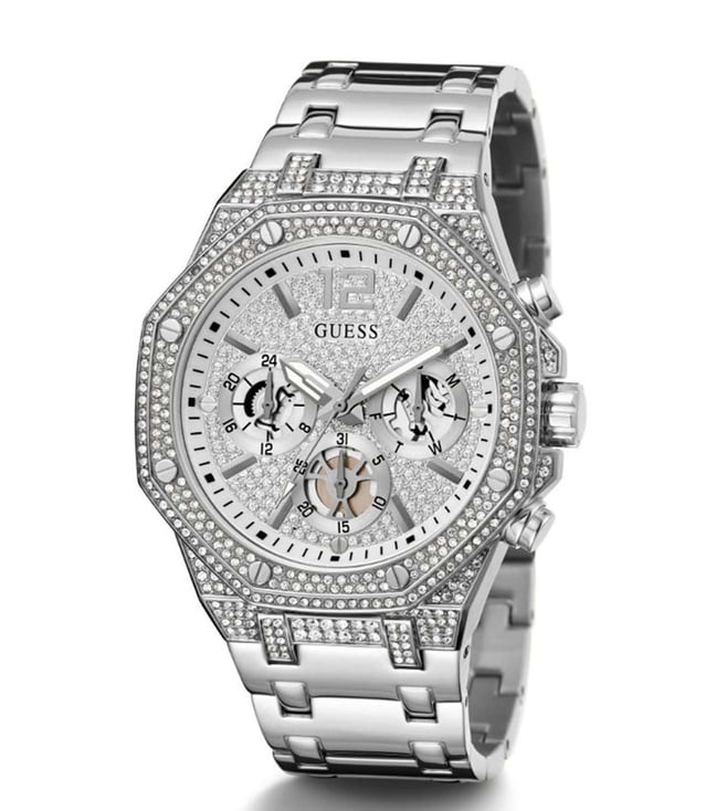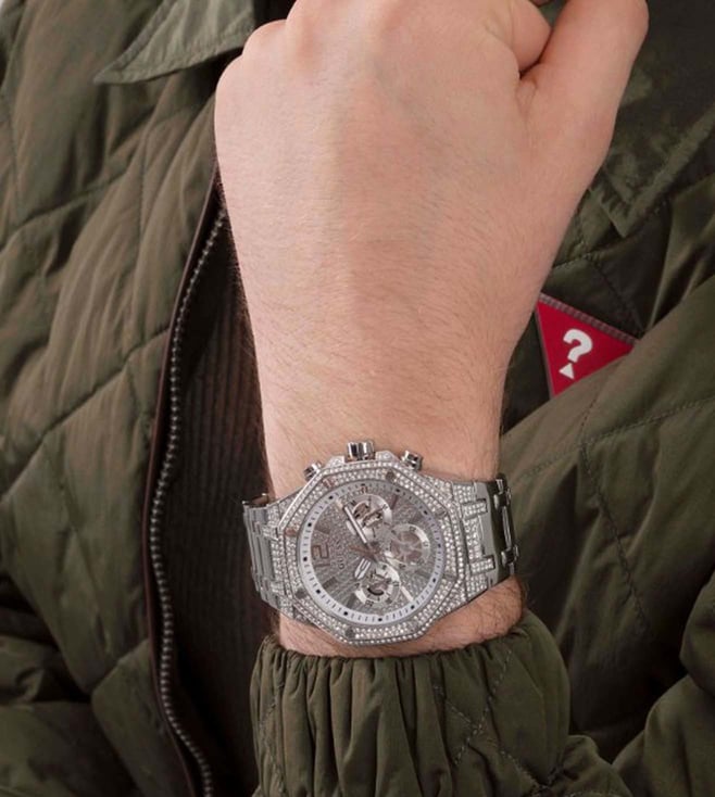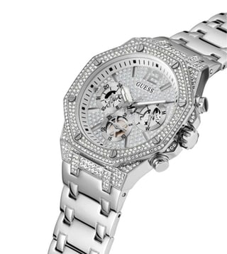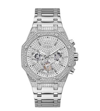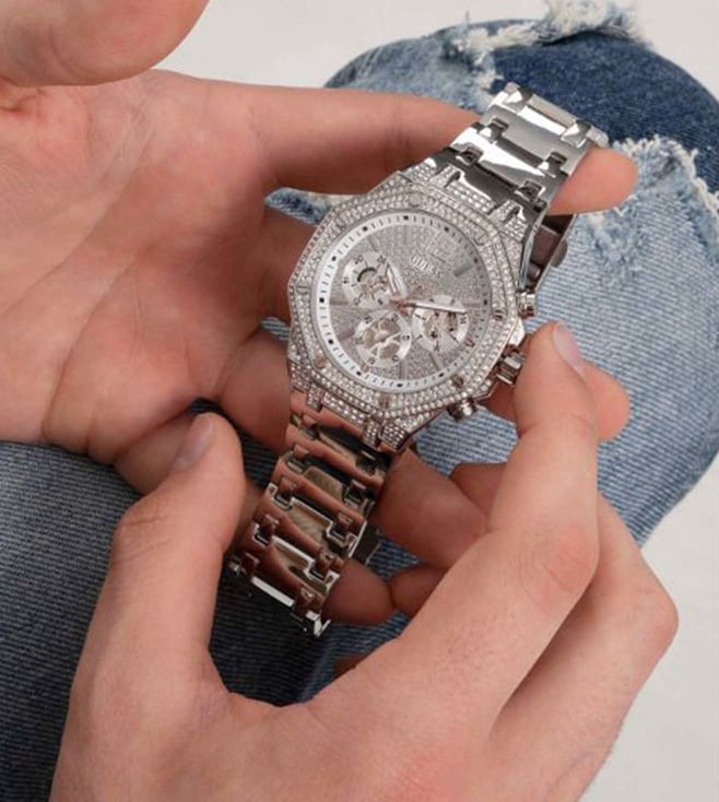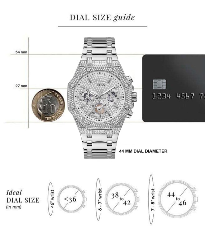 Stay updated with the latest fashion trends by owning this analog watch from Guess. An uber fusion of style with functionality, this timepiece features a 44 mm dial with iconic elements. Secured by a mineral glass, the round dial is functional on a quartz movement. The matching bracelet comes in a subtle hue that further elevates the look of the watch.