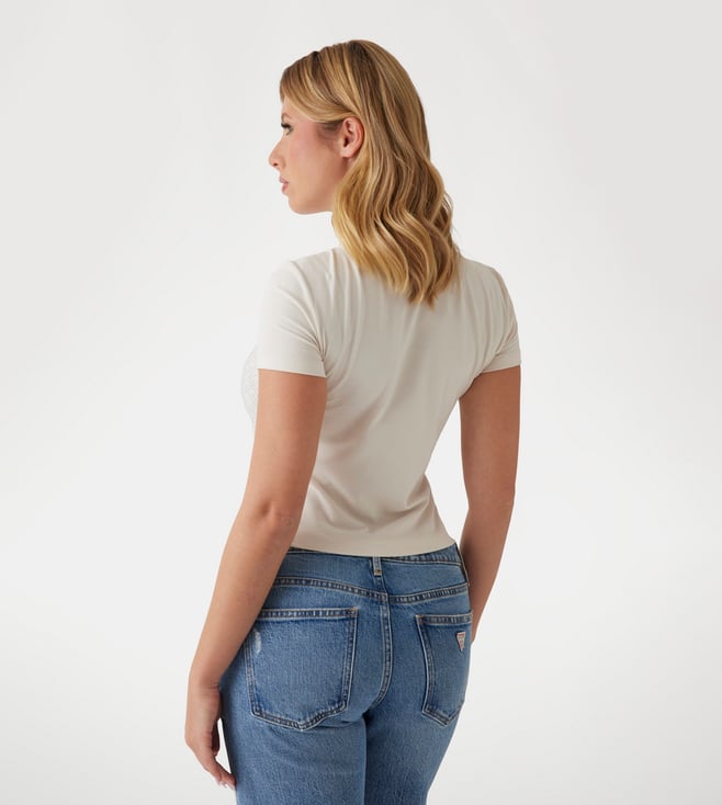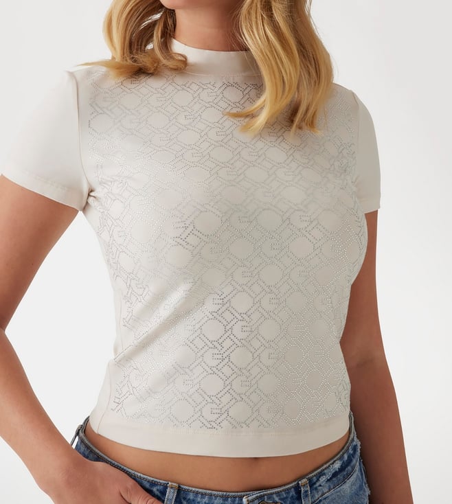 Elevate your wardrobe with this chic off-white T-shirt, featuring a regular fit and embellished pattern. Crafted from a soft cotton blend, it offers comfort and style. The short sleeves and mock collar add a modern touch, while the pull-on closure ensures easy wear. Perfect for casual outings or relaxed gatherings.